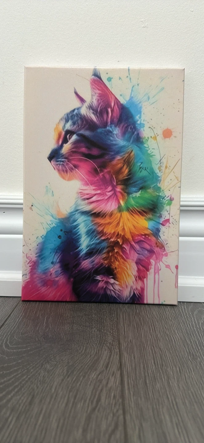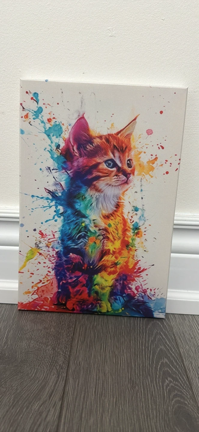 This set features three colourful kitten canvas prints with a vibrant watercolour splash design. It's a great addition to any cat lover's home. Printed on canvas with a white background.