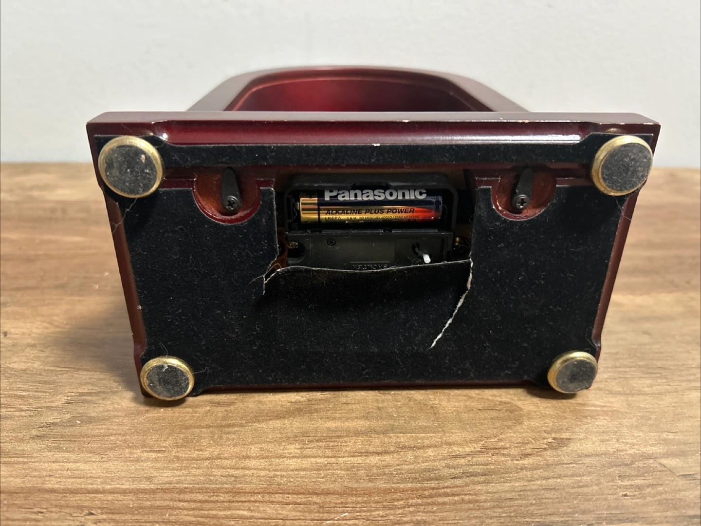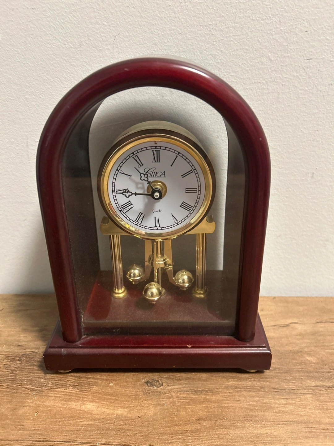 This Circa quartz mantle clock features a classic design with Roman numerals and a pendulum. It's housed in a rich, dark wood-toned casing with gold accents. Battery operated, it would look great on any shelf or table.