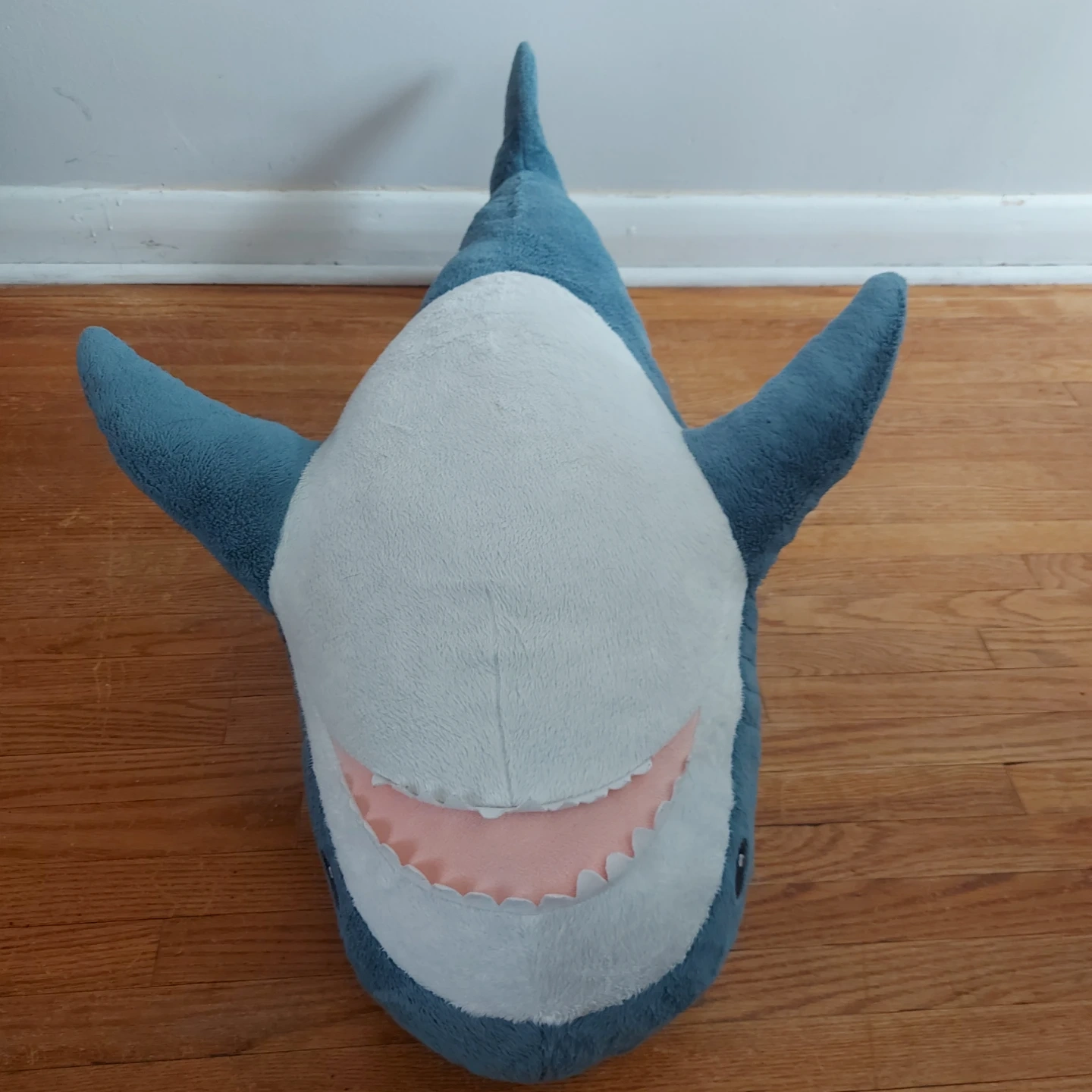 This is a used large Ikea Blahaj plush shark, perfect as a cuddly companion or a fun decorative piece for a kid's room. It's in good condition and ready for a new home!