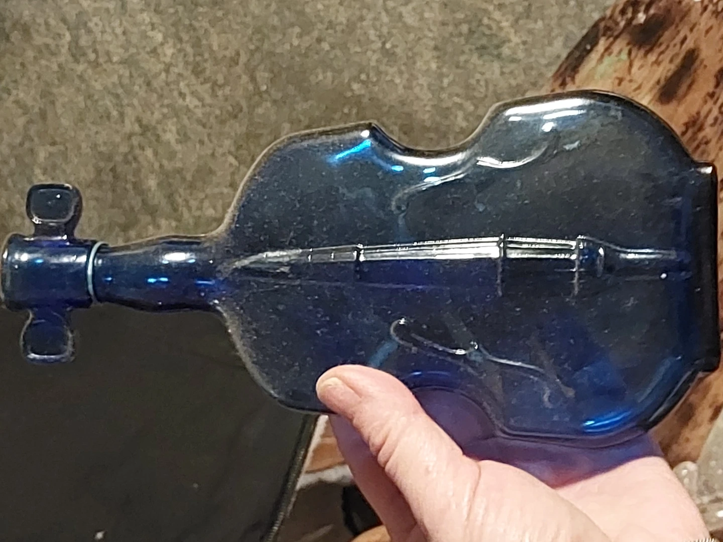 This is a unique blue glass bottle shaped like a violin. It has decorative etching resembling strings and a bridge. The bottle's neck has a stopper with a double-loop design.