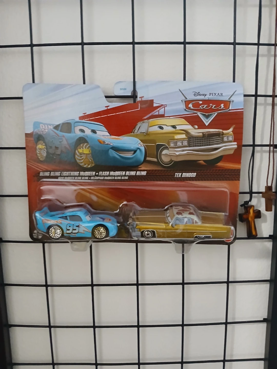 This is a 2-pack of Disney Pixar Cars toys featuring Bling Bling Lightning McQueen and Tex Dinoco. Made by Mattel. Perfect for any Cars fan!
