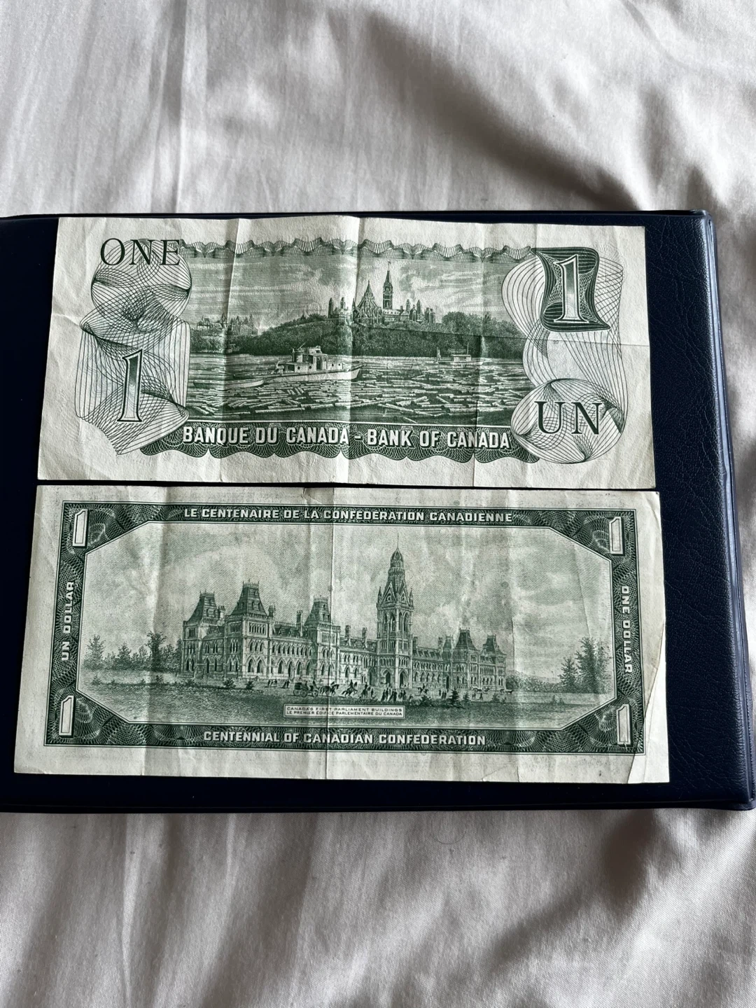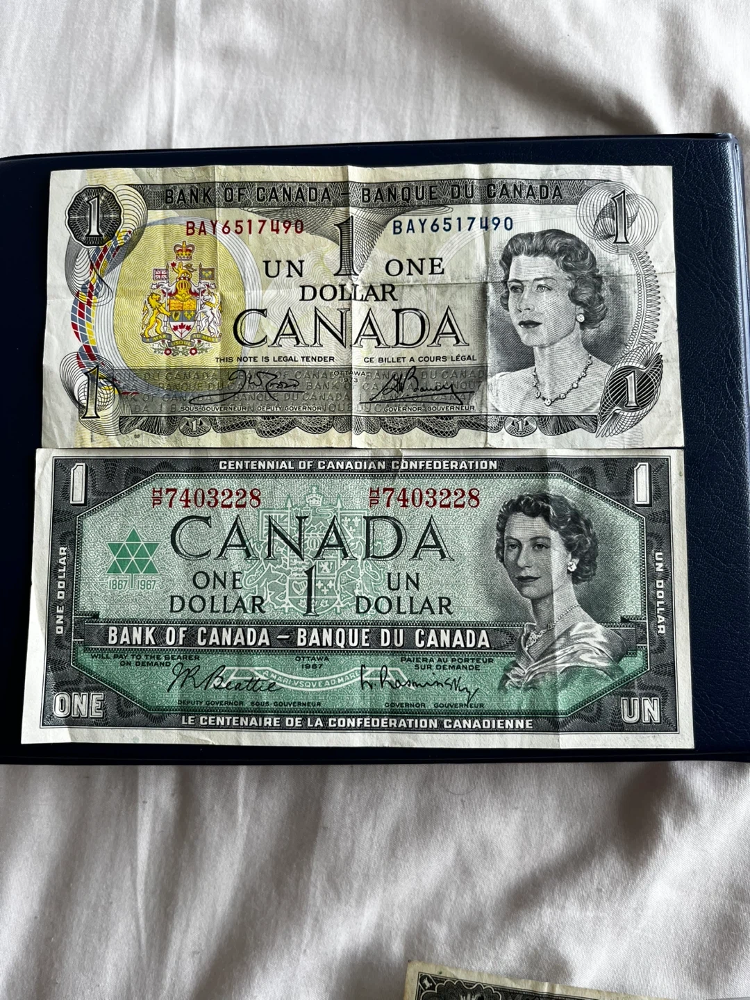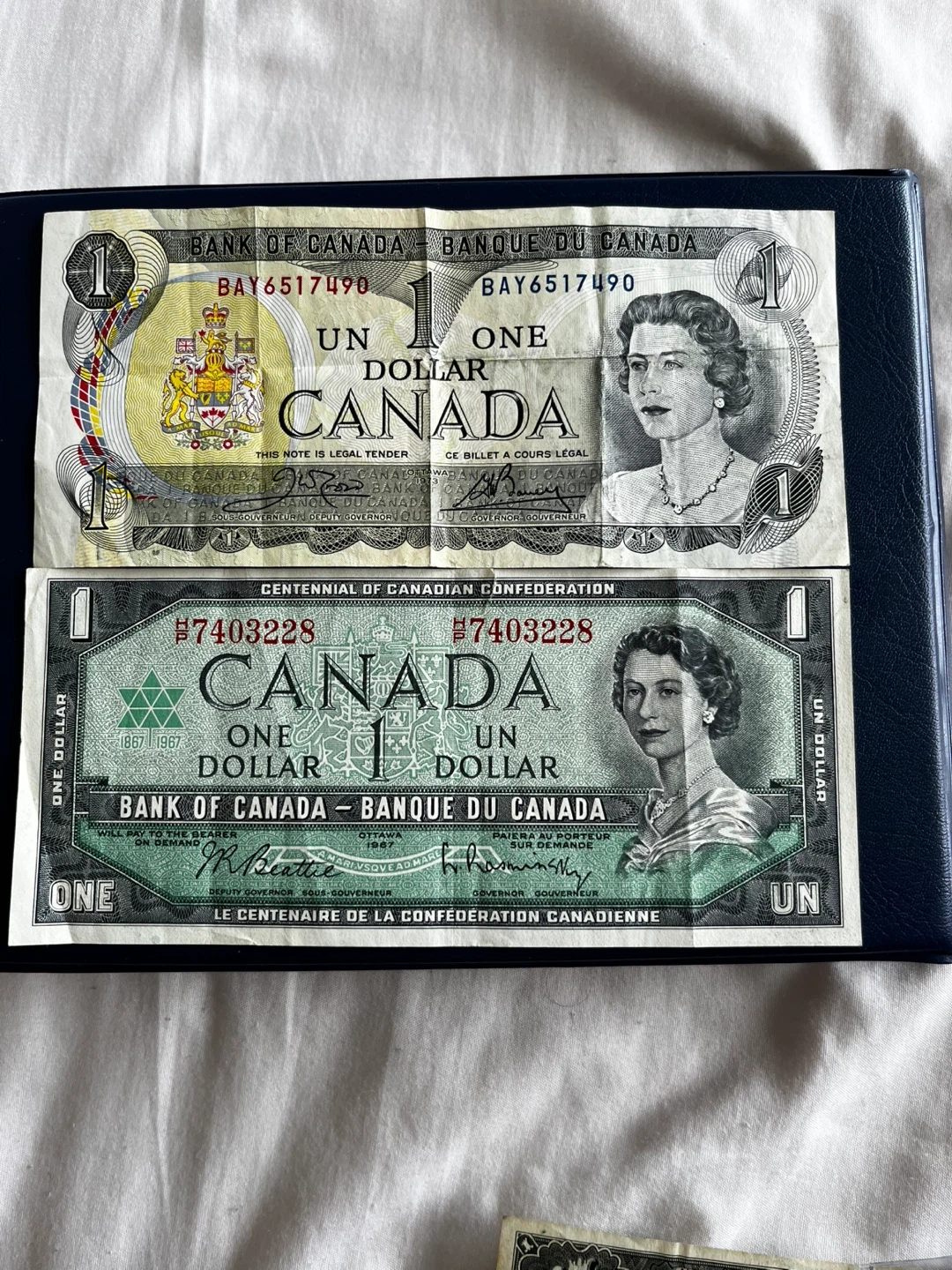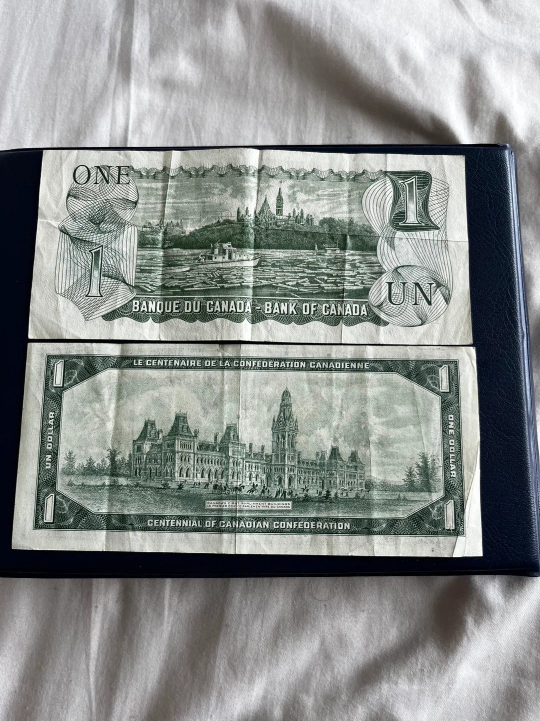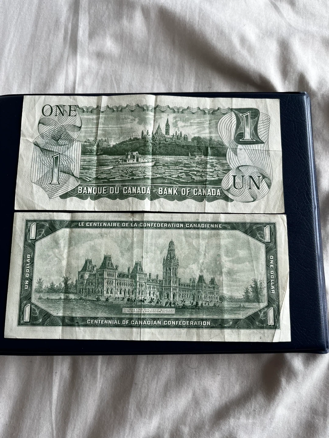 30 dollars each Includes one 1967 Bank of Canada one dollar bill featuring Queen Elizabeth II and Parliament Hill. Also includes one 1967 Centennial of Canadian Confederation one dollar bill featuring Queen Elizabeth II and Canada's Parliament buildings. These are collector's items from 1967!