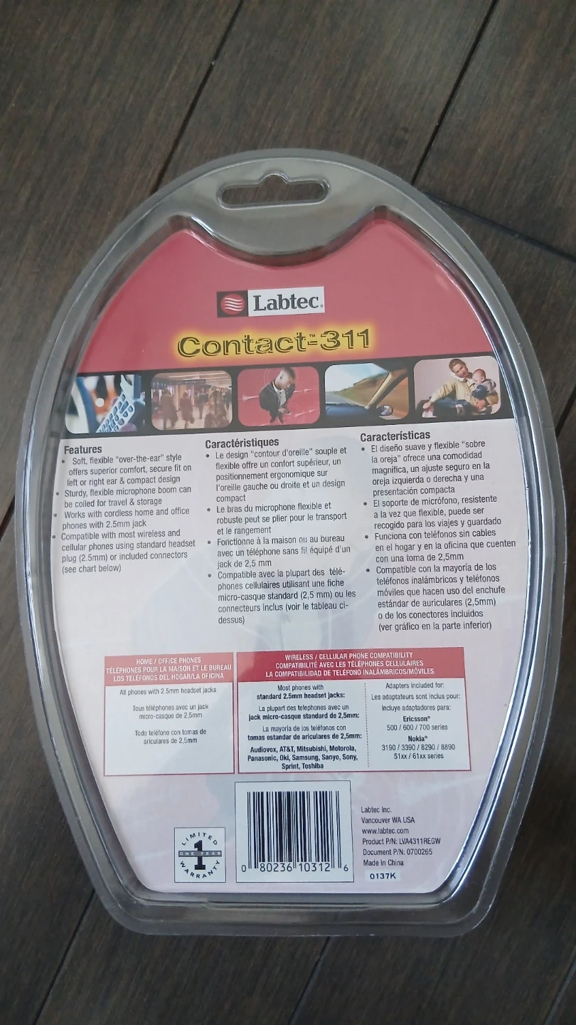 This Labtec Contact-311 headset offers a comfortable 'over-the-ear' design for hands-free use. It's compatible with most wireless, cellular, and cordless phones. The headset connects via a standard 2.5mm jack.