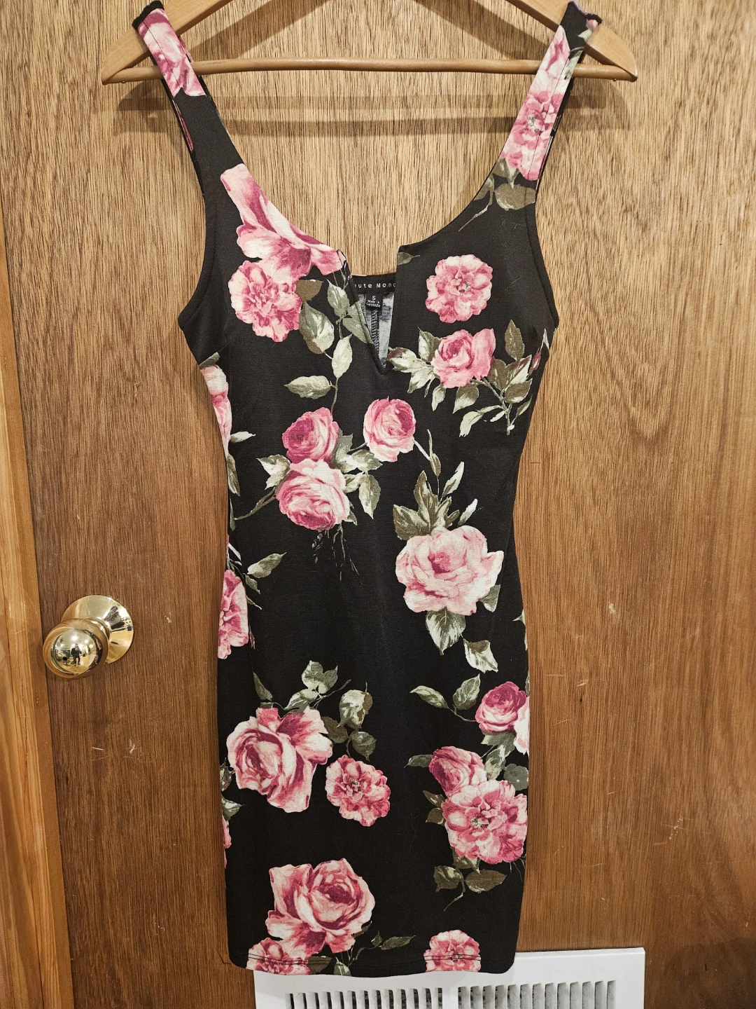 Cute Haute Monde mini dress with a floral print! It's a size small and made of 97% polyester and 3% spandex