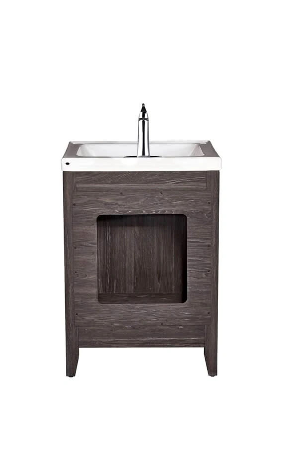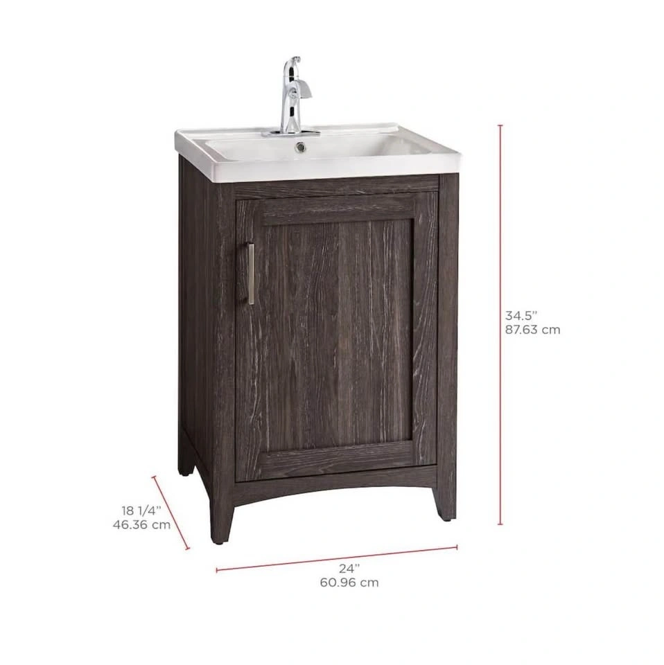 Stylish vanity for your bathroom. Espresso finish with a white ceramic sink. Includes cabinet for storage. Measures 24 inches wide, 18 1/4 inches deep, and 34.5 inches high. Faucet is not included.