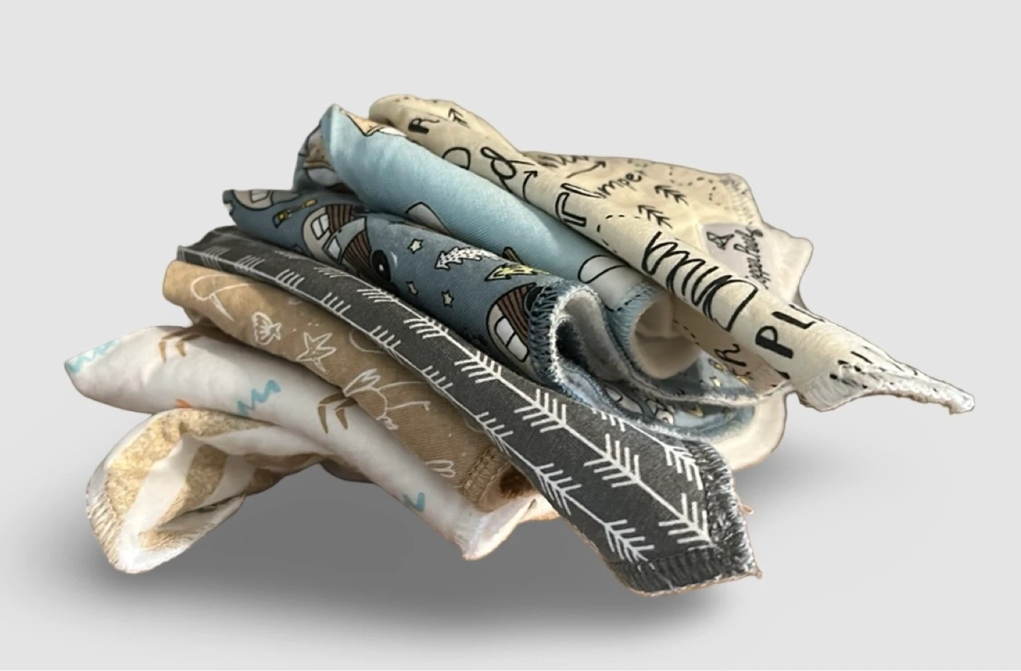 A bundle of soft, absorbent burp cloths featuring various playful prints. Made from gentle fabric perfect for baby's sensitive skin. Assorted patterns include campers, arrows, and woodland themes.