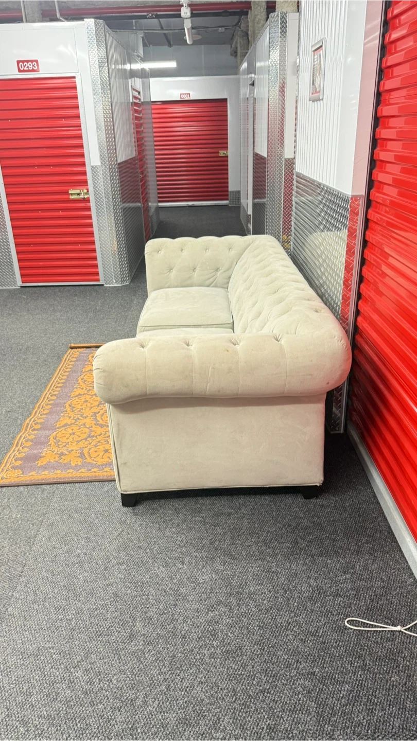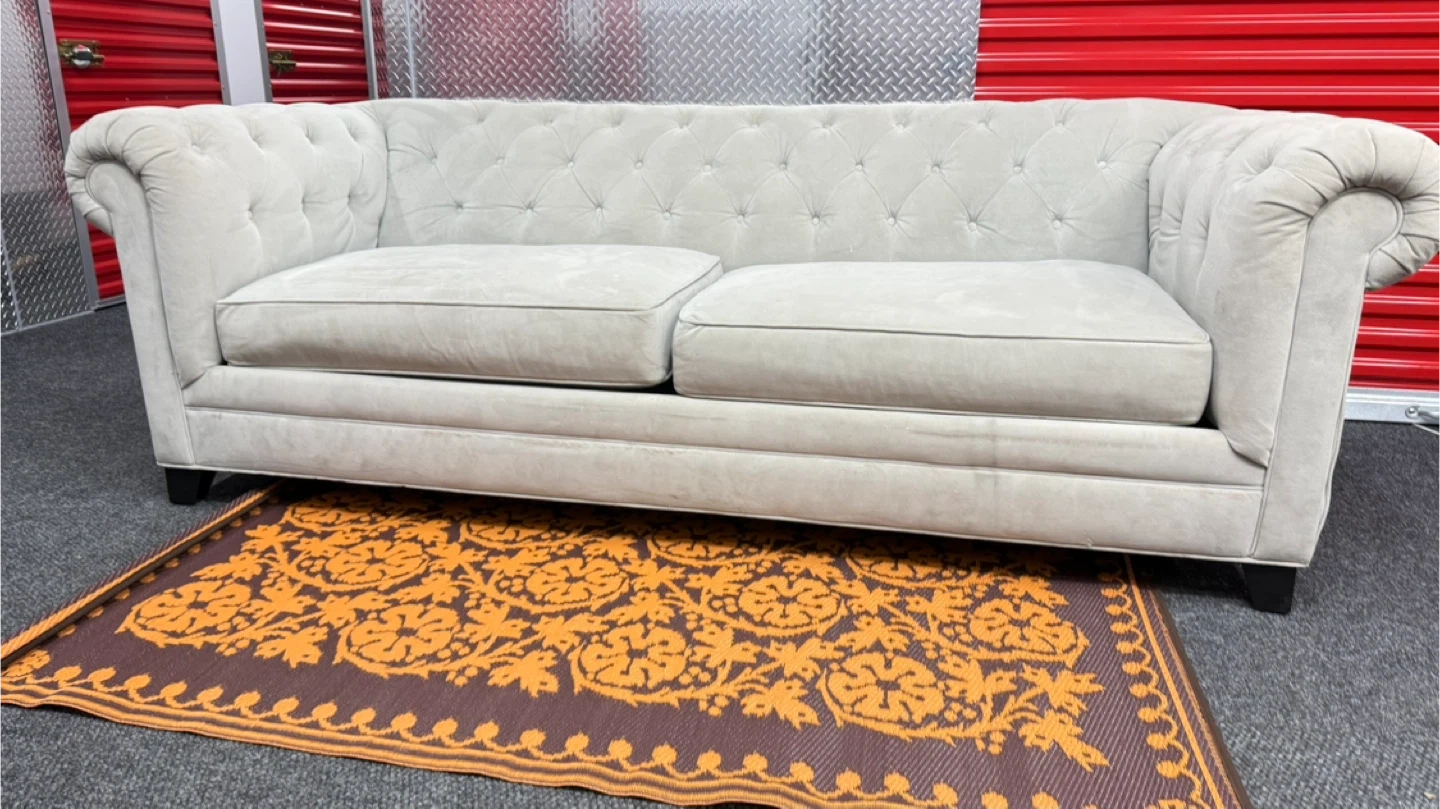 This light gray sofa features a classic tufted Chesterfield design with rolled arms. It's upholstered in a soft fabric. Two seat cushions provide comfort. It's a nice addition to any living space!