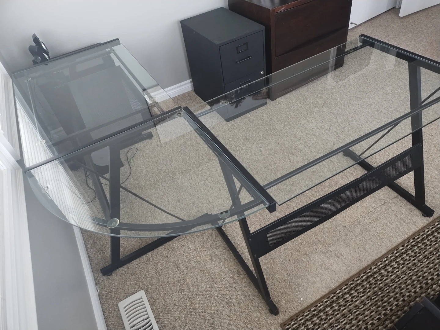 A modern L-shaped computer desk with a clear glass top and black metal frame. It's spacious and designed for a computer setup. The desk is constructed from durable glass and metal, offering ample workspace.