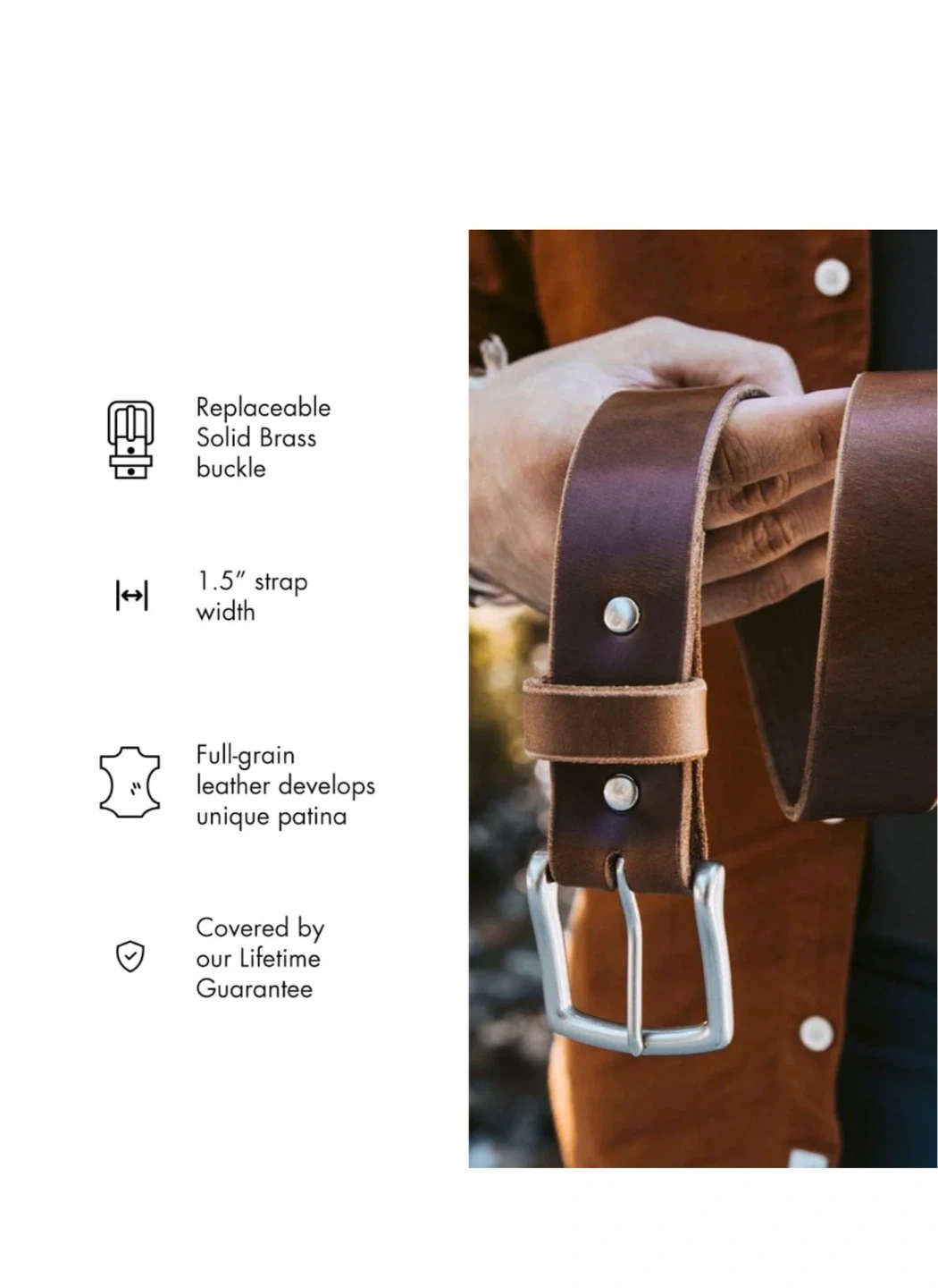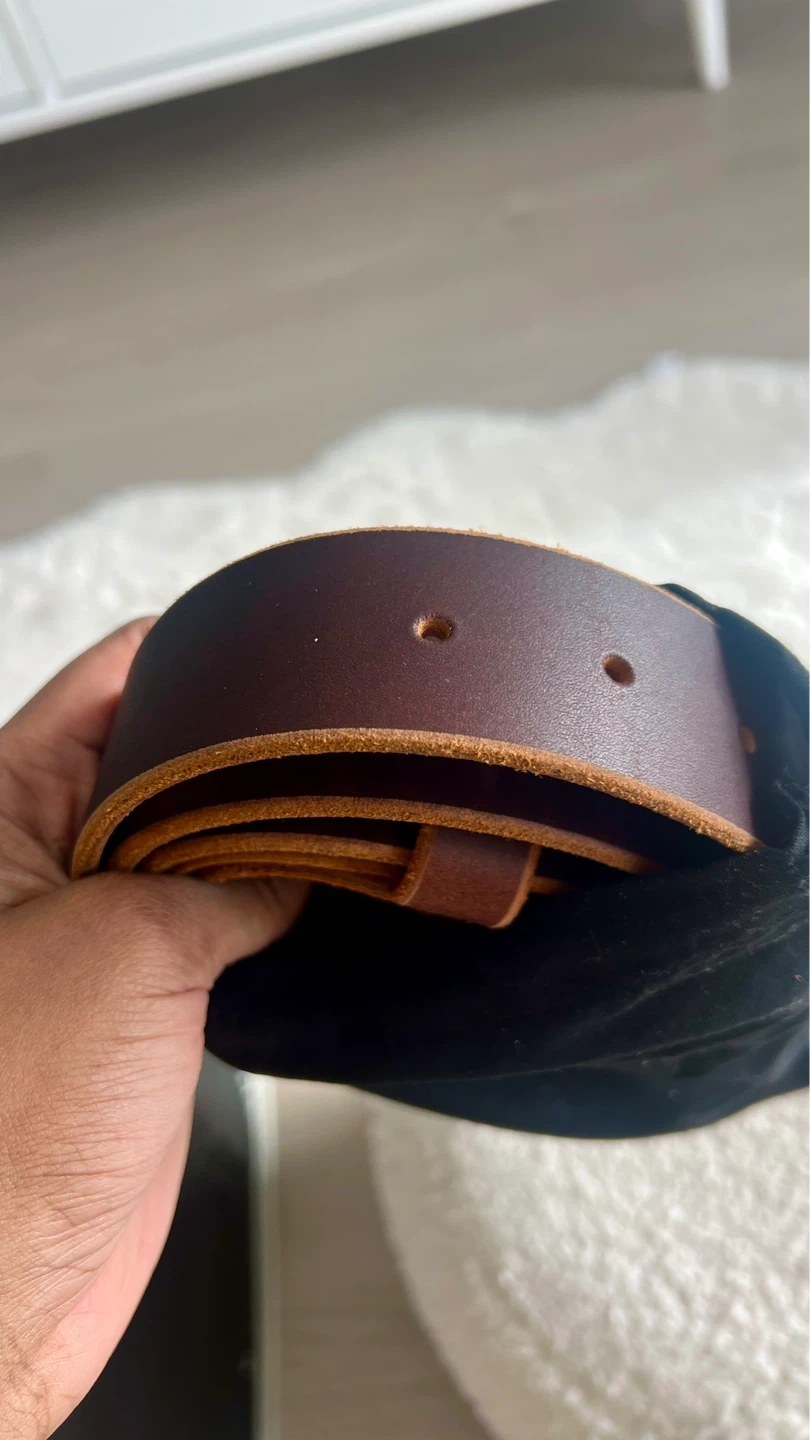 This is a Popov Leather belt crafted from full-grain leather. It features a replaceable solid brass buckle and a 1.5" strap width. This belt's leather develops a unique patina over time.
