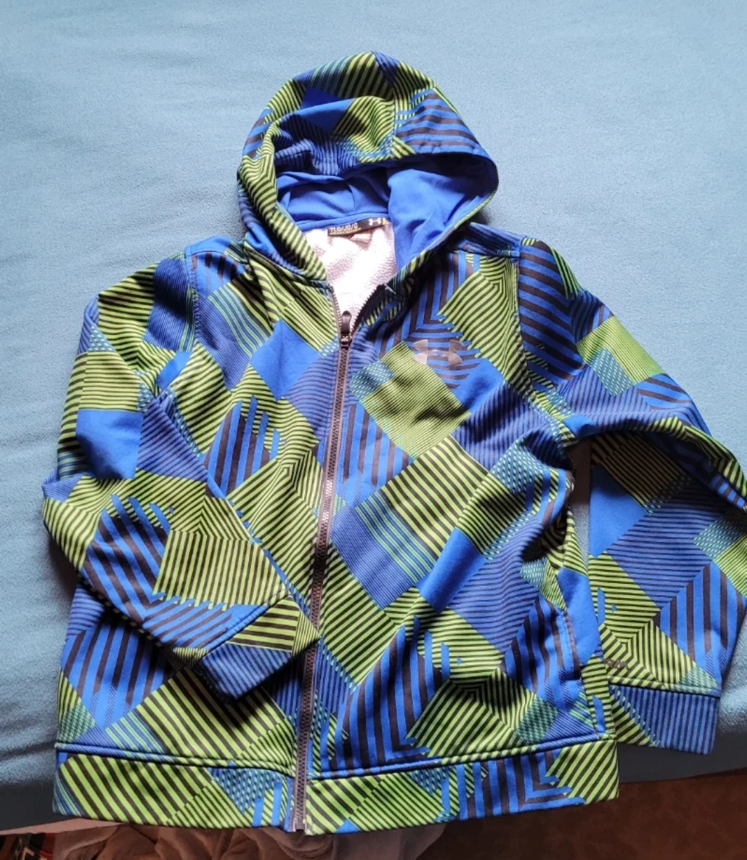 This is an Under Armour zip-up hoodie with a colourful geometric pattern. It features a full zip closure and a hood. It's great for layering!