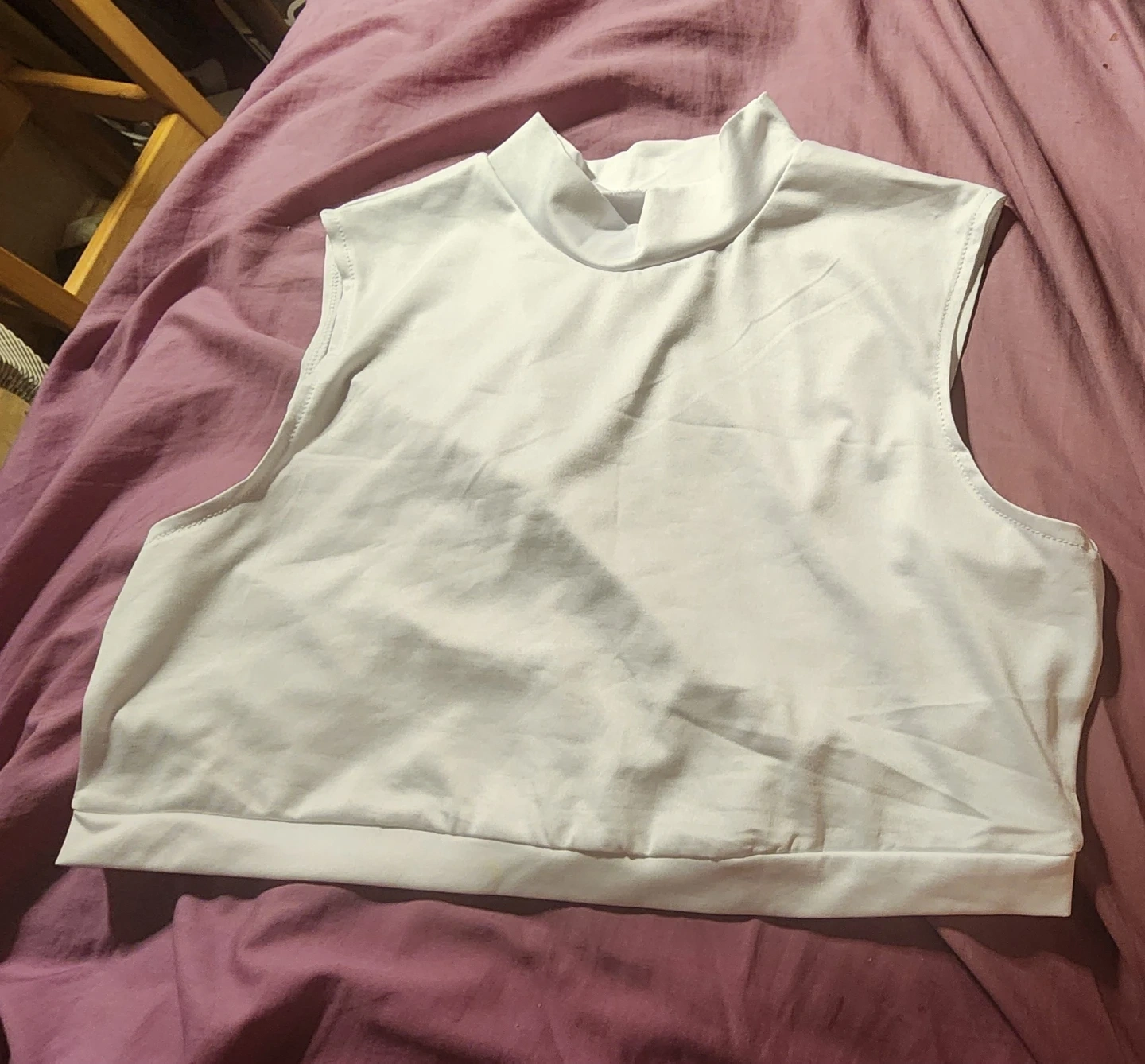 This is a white, sleeveless crop top with a mock neck. It's made from a soft, stretchy material. It's a great layering piece for cooler weather!