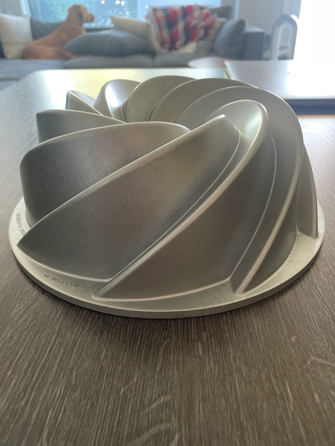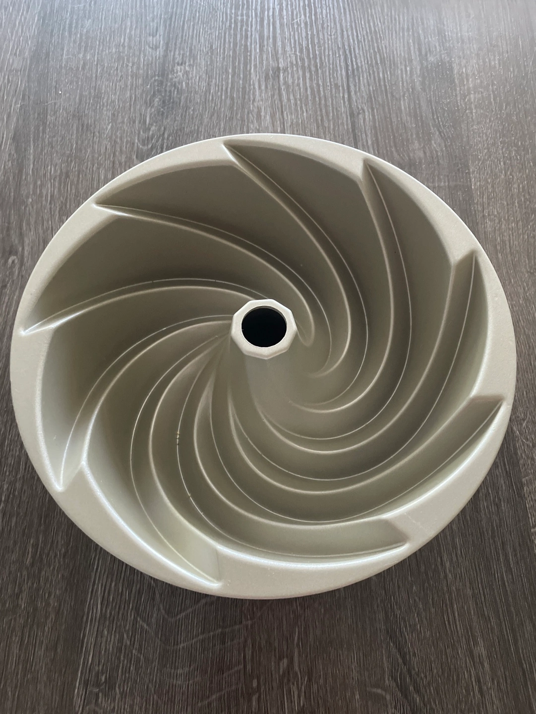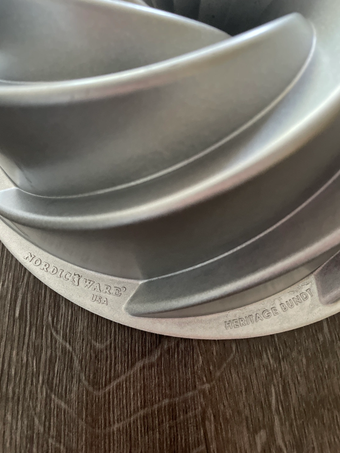A Nordic Ware Heritage Bundt cake pan, featuring a traditional spiral design. The pan is made of durable aluminum and has a non-stick coating. The pan is perfect for making beautiful and delicious bundt cakes.