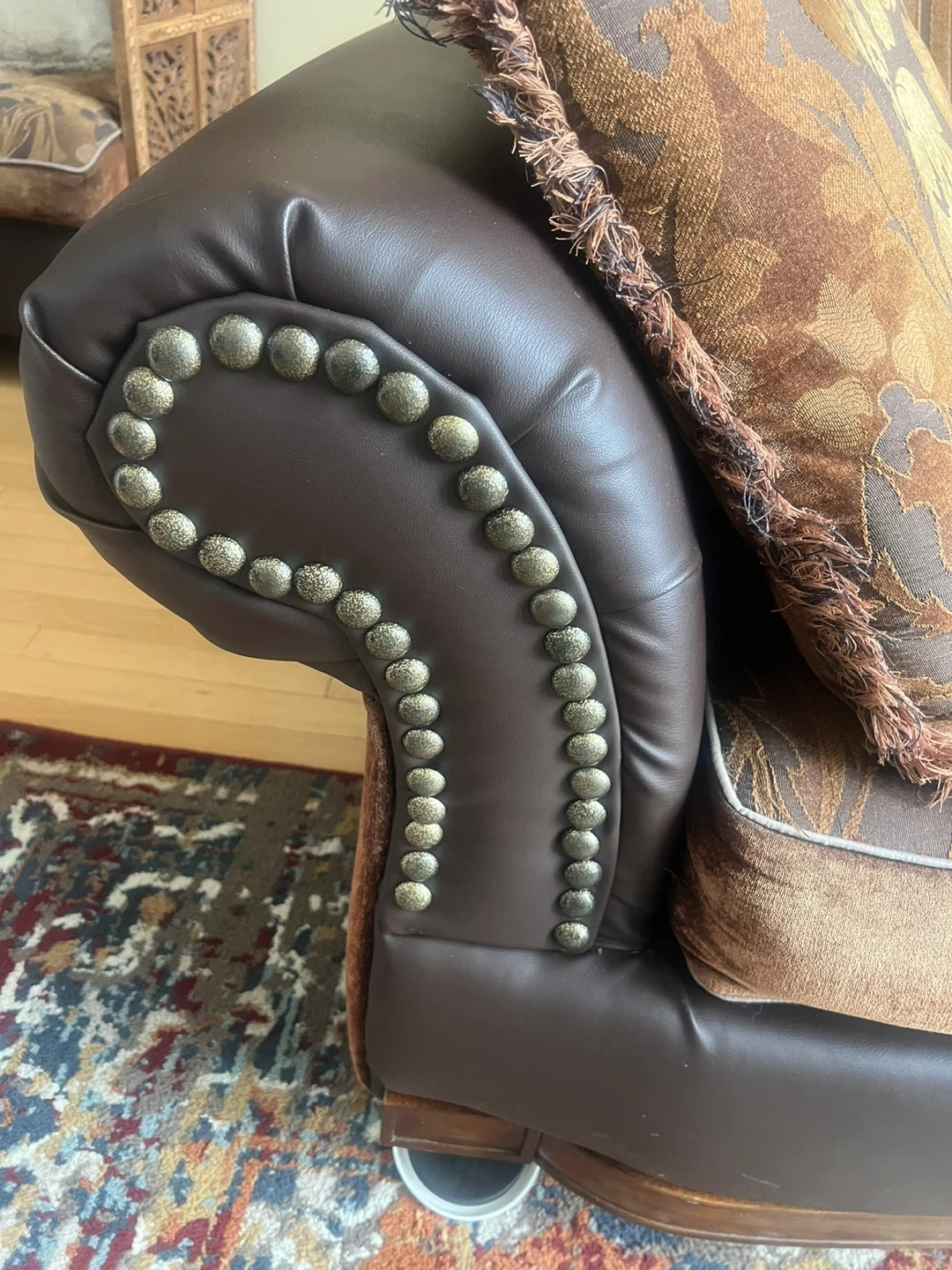 A stylish brown leather sofa with detailed decorative stud accents on the arms. It features upholstered cushions with an ornate pattern. This sofa would be a lovely addition to any living room!