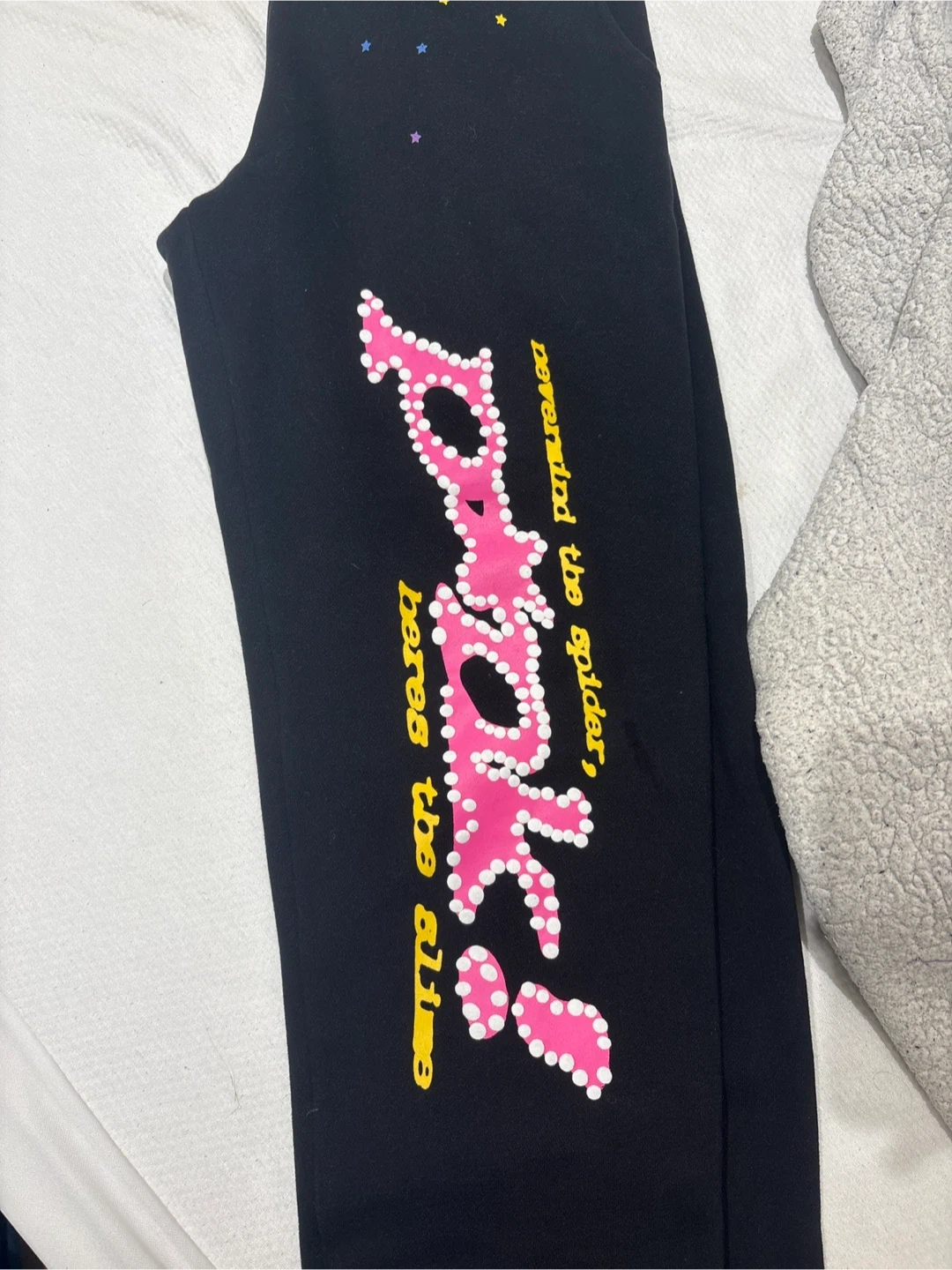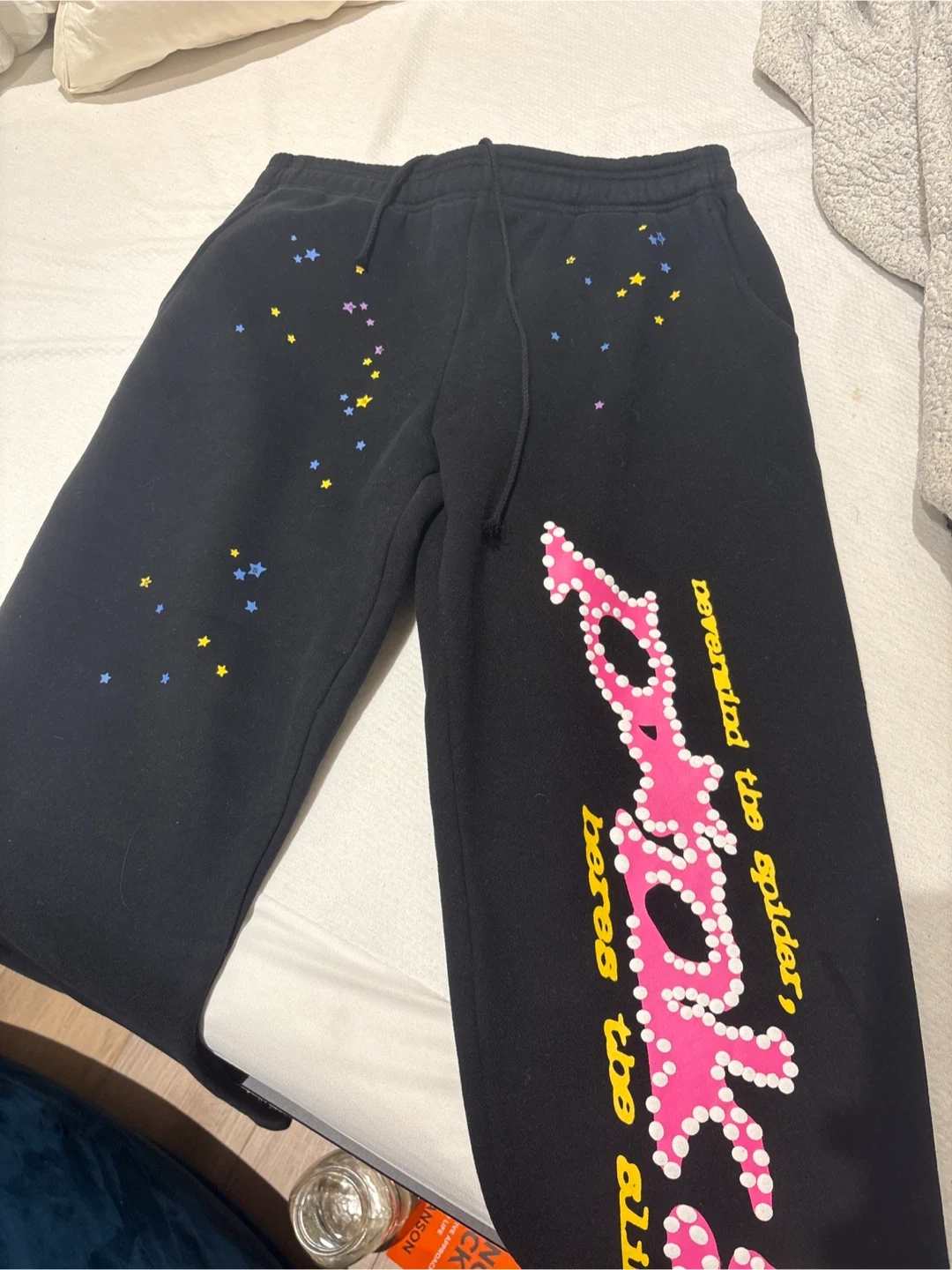 Black sweatpants featuring a large pink graphic on the leg with text "nevermind the spider, heres the all". It's decorated with small star designs. Drawstring waist.
