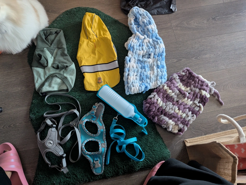 Includes two dog leashes and harnesses, a yellow dog coat with reflective stripes, a hooded grey dog sweater, and a blue portable water bottle. Also includes two knitted dog sweaters in blue/white and purple/grey colourways. Great for keeping your furry friend comfortable and safe on walks! used for pomeranian puppy. 2nd pic for scale.