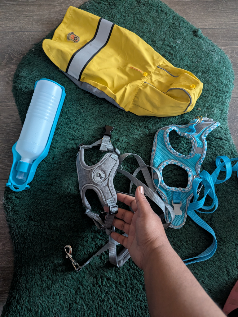 Includes two dog leashes and harnesses, a yellow dog coat with reflective stripes, a hooded grey dog sweater, and a blue portable water bottle. Also includes two knitted dog sweaters in blue/white and purple/grey colourways. Great for keeping your furry friend comfortable and safe on walks! used for pomeranian puppy. 2nd pic for scale.