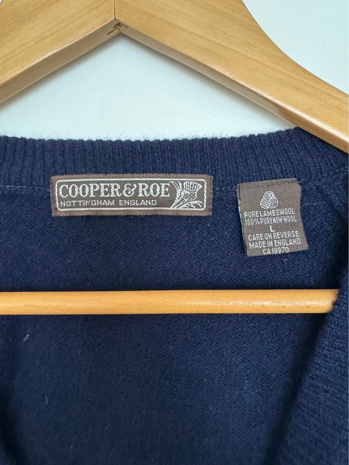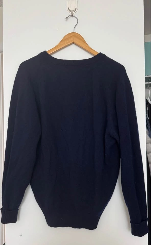 Beautiful dark blue sweater, 100% new lambswool from New England. Machine washable, air dry. Small hole from being caught on a clothing hanger. Men's size large.