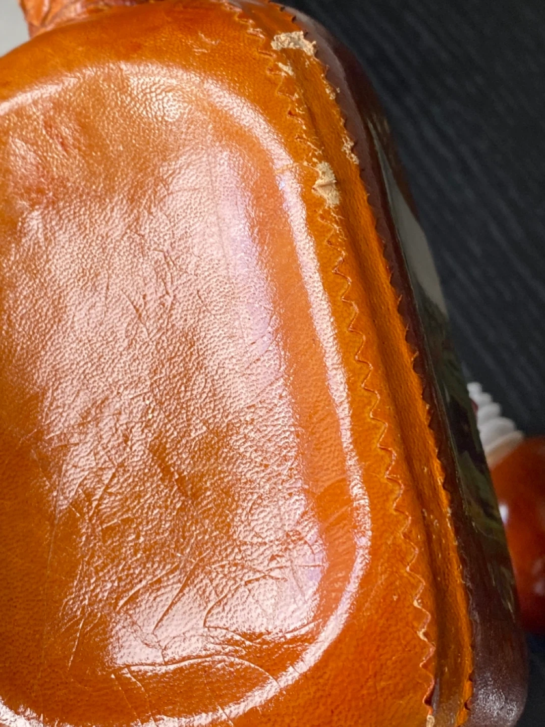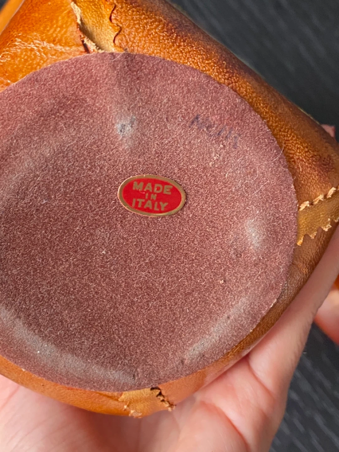 This is a vintage decanter wrapped in genuine leather, featuring a charming hunting scene. It's made in Italy and includes the original wooden stopper. The craftsmanship is excellent!