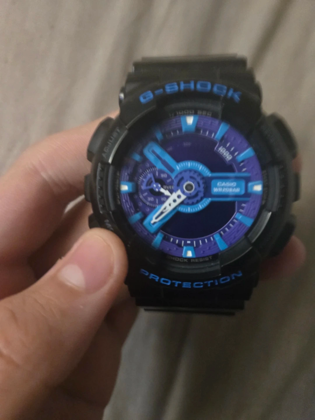 This black G-Shock watch features a blue and purple dial with analog and digital time displays. It offers shock resistance and 200m water resistance. Great for sports and everyday wear!