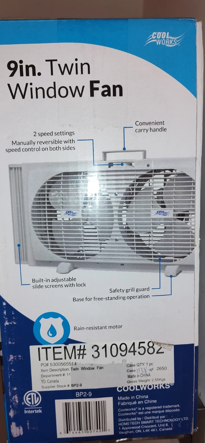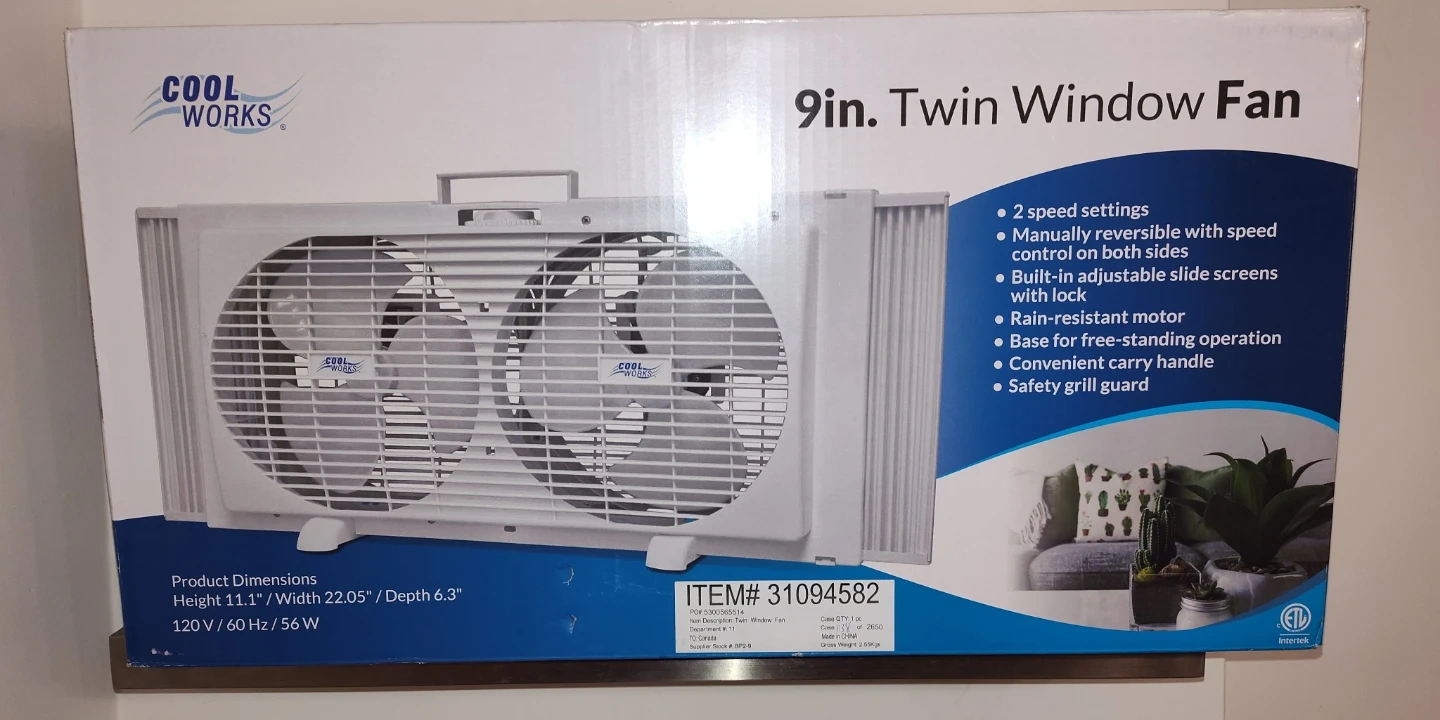 Cool Works 9in. twin window fan with 2 speed settings. Manually reversible with speed control on both sides. Built-in adjustable slide screens with lock. Includes a rain-resistant motor and a convenient carry handle. Base for free-standing operation with a safety grill guard.