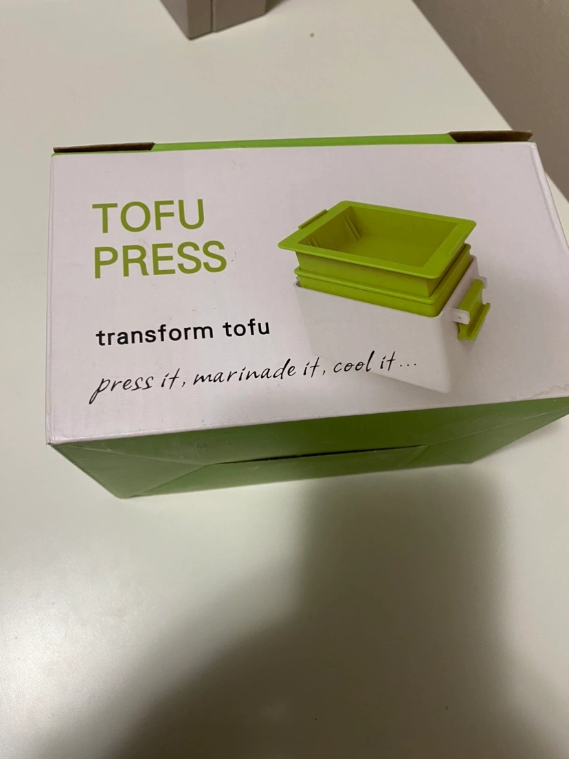 Green and white tofu press in original packaging. It has a lever to apply pressure. The box says, "Transform tofu, press it, marinade it, cool it."