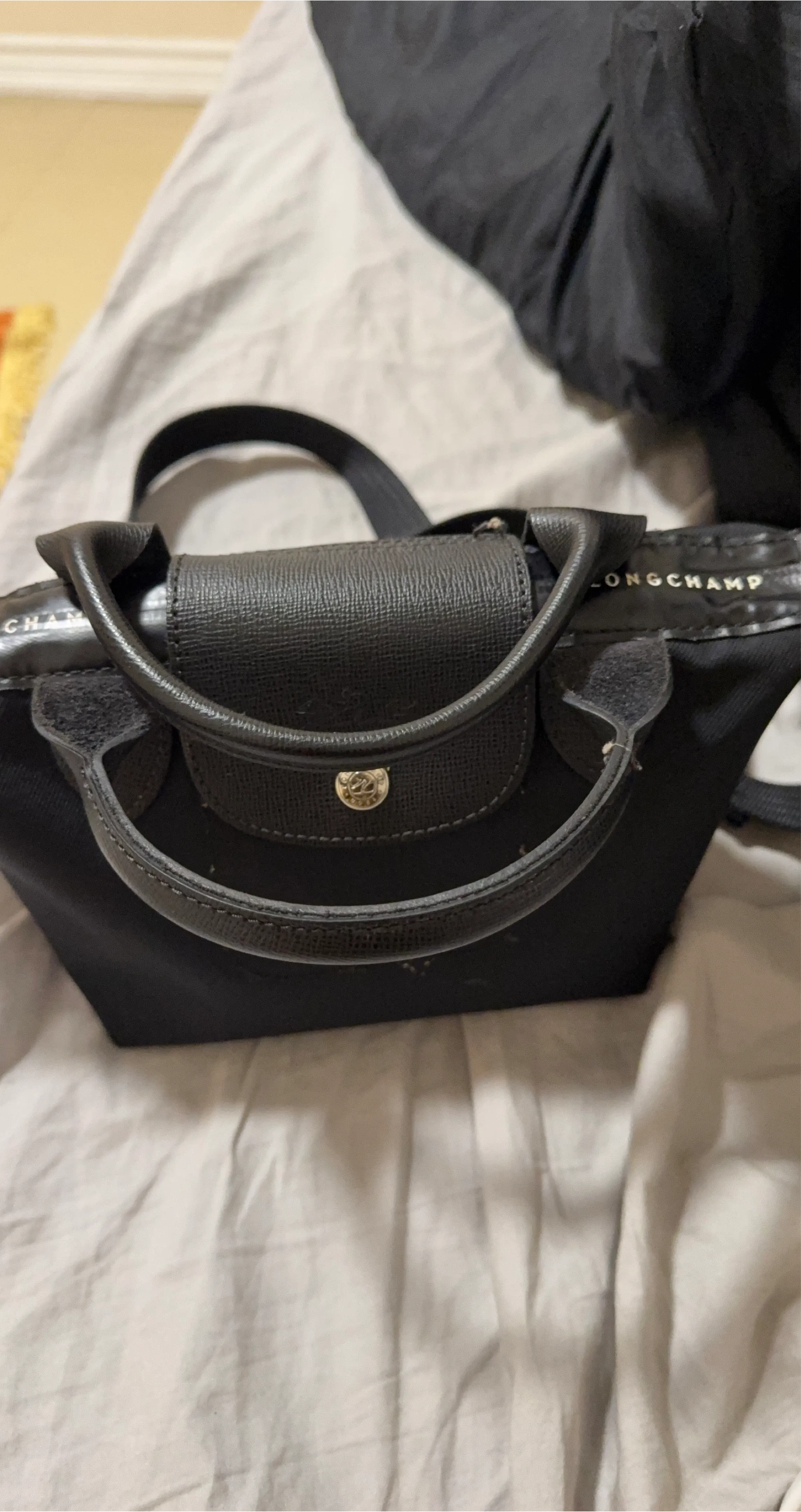 Selling a Longchamp mini Le Pliage handbag in black. It's a cute and compact size, perfect for carrying essentials. The bag features the classic Longchamp design with leather accents and a secure closure. It's in great condition and ready for a new owner!