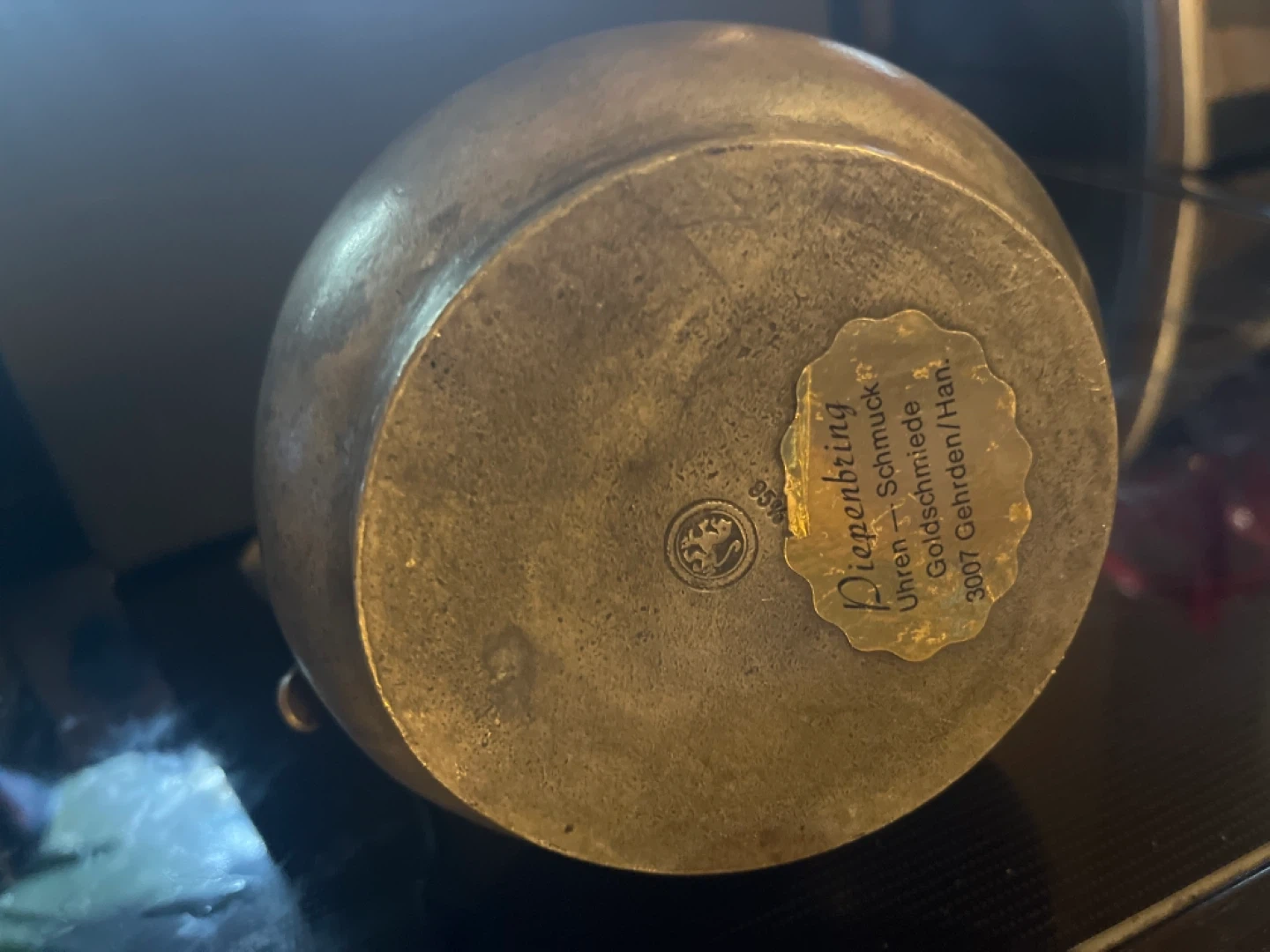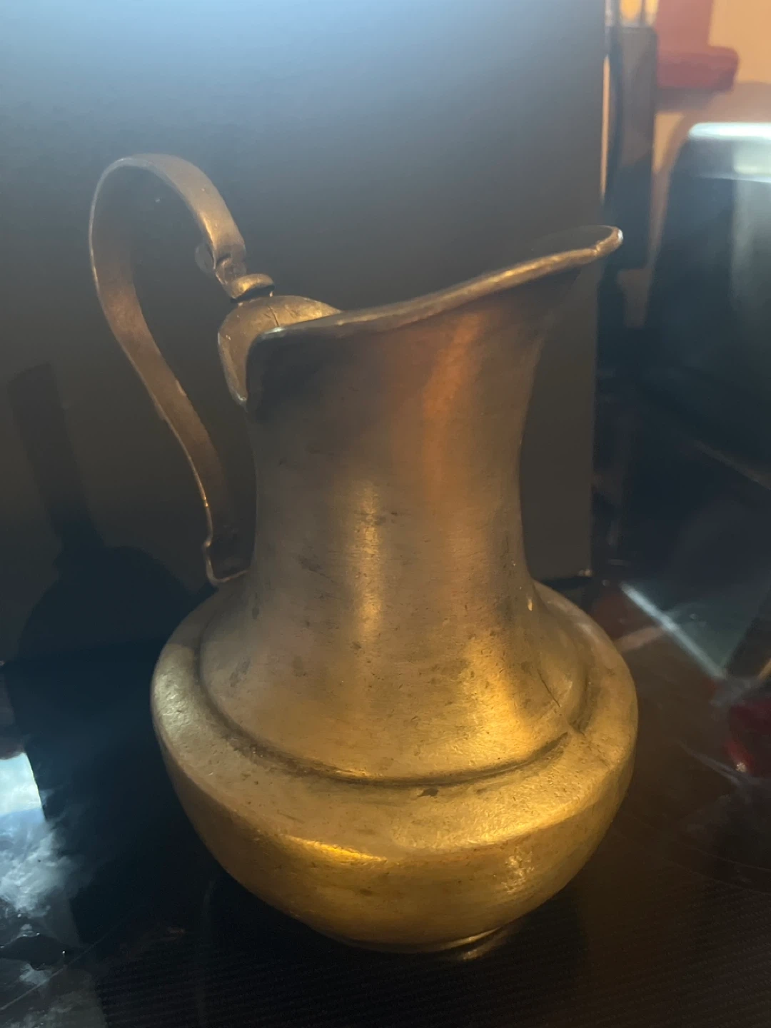 This is a Dienpenbring pitcher, likely made of pewter. It has a classic, vintage design and a sturdy handle. This pitcher could be used as a decorative item or for serving drinks.