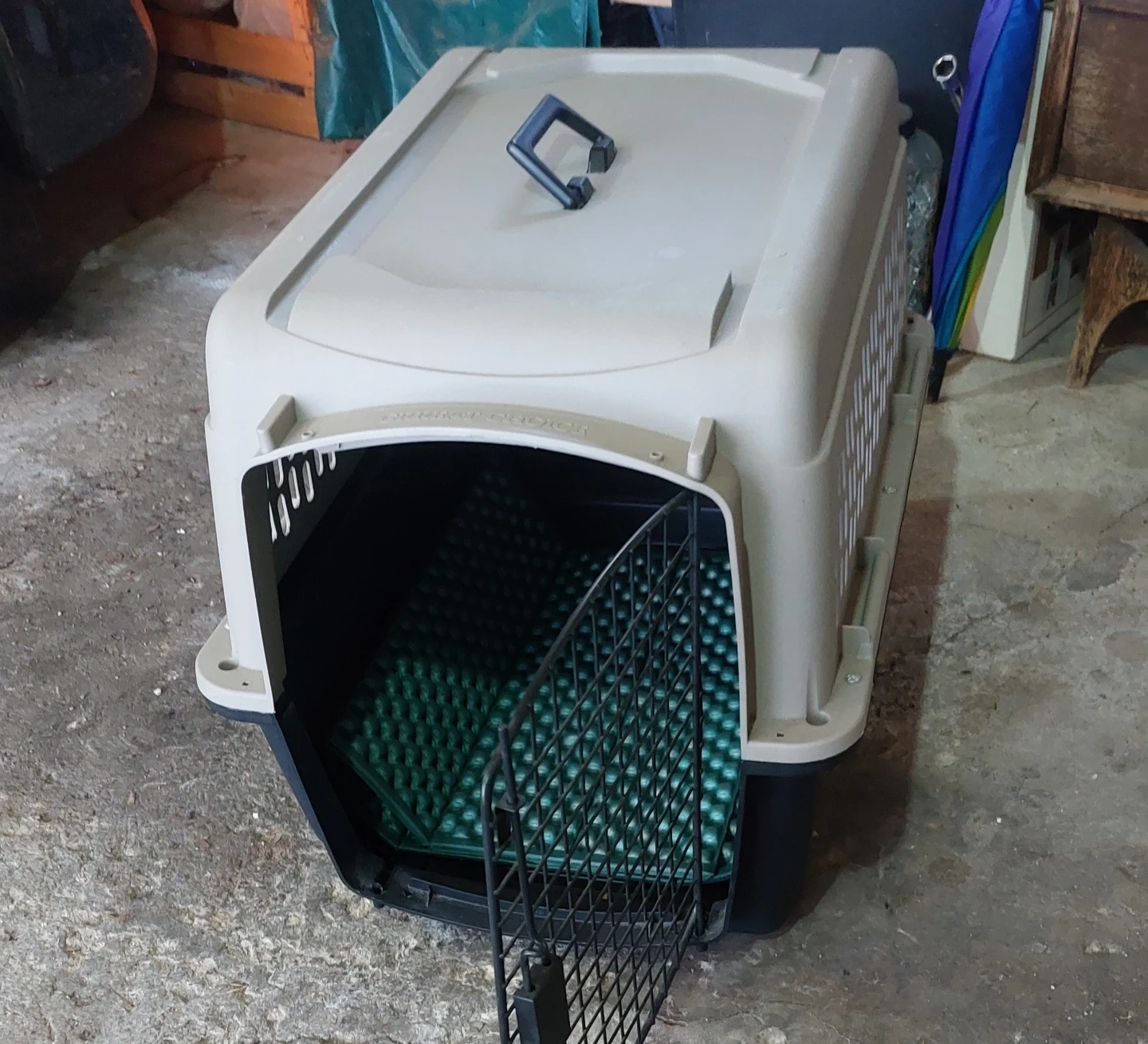 Selling a Great Choice pet carrier in good condition. It measures approximately 20 inches wide, 27 inches deep, and 21 inches tall. Perfect for safely transporting your furry friend!