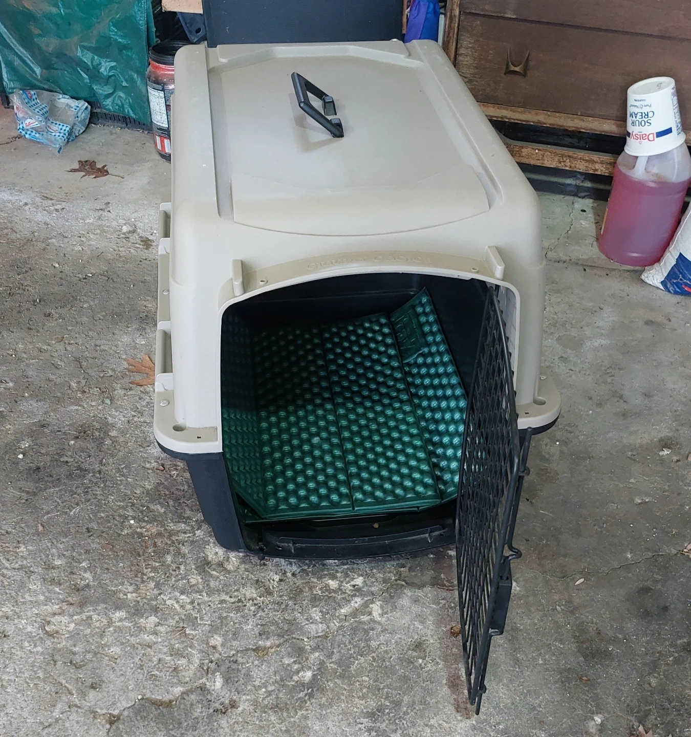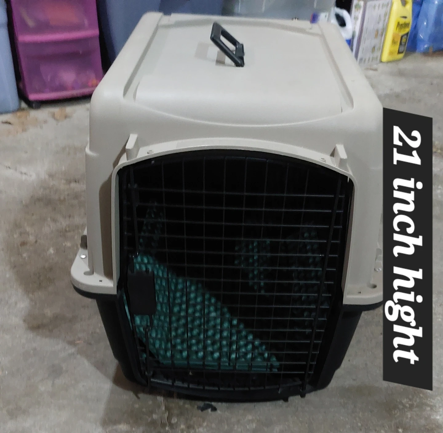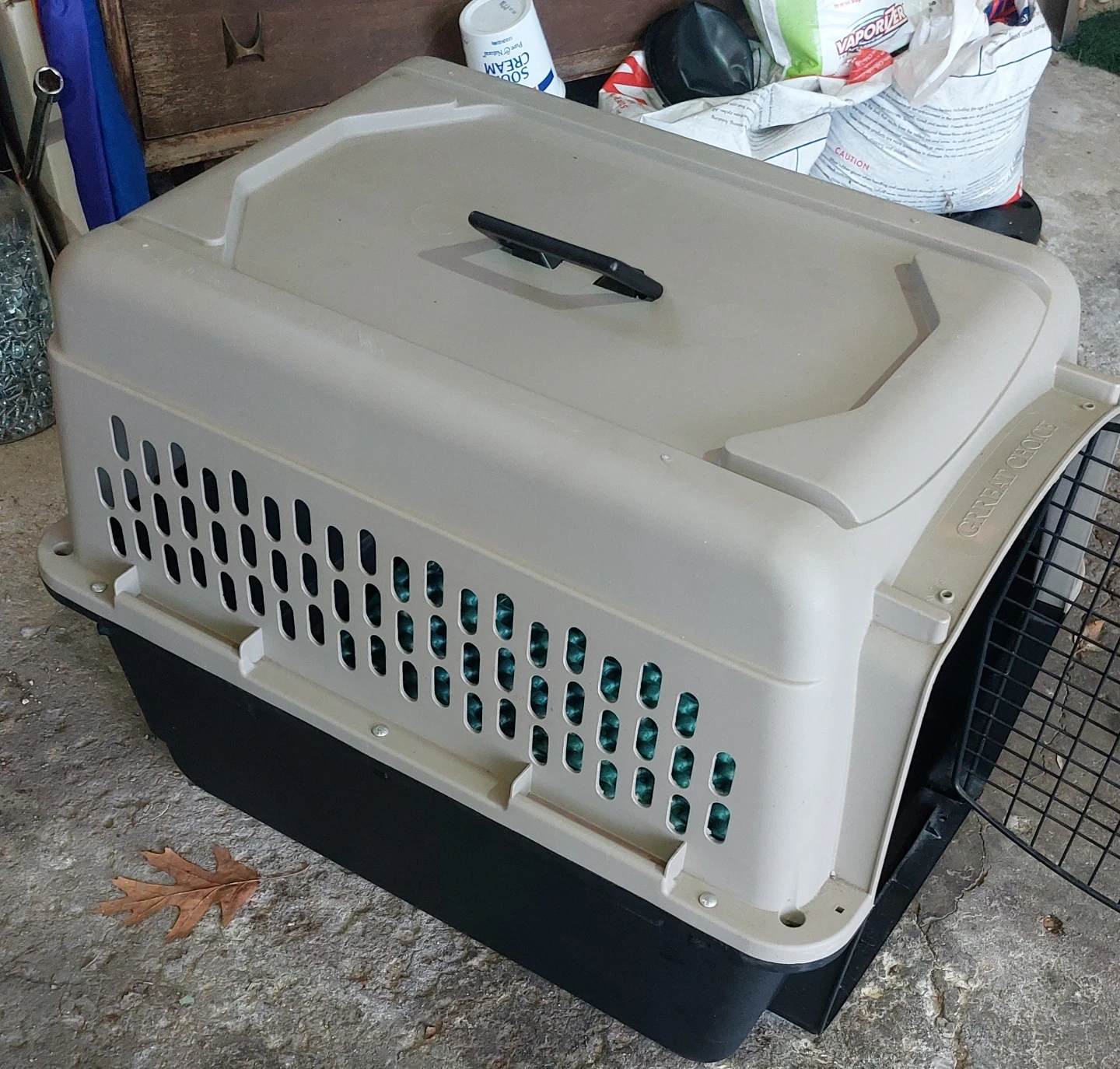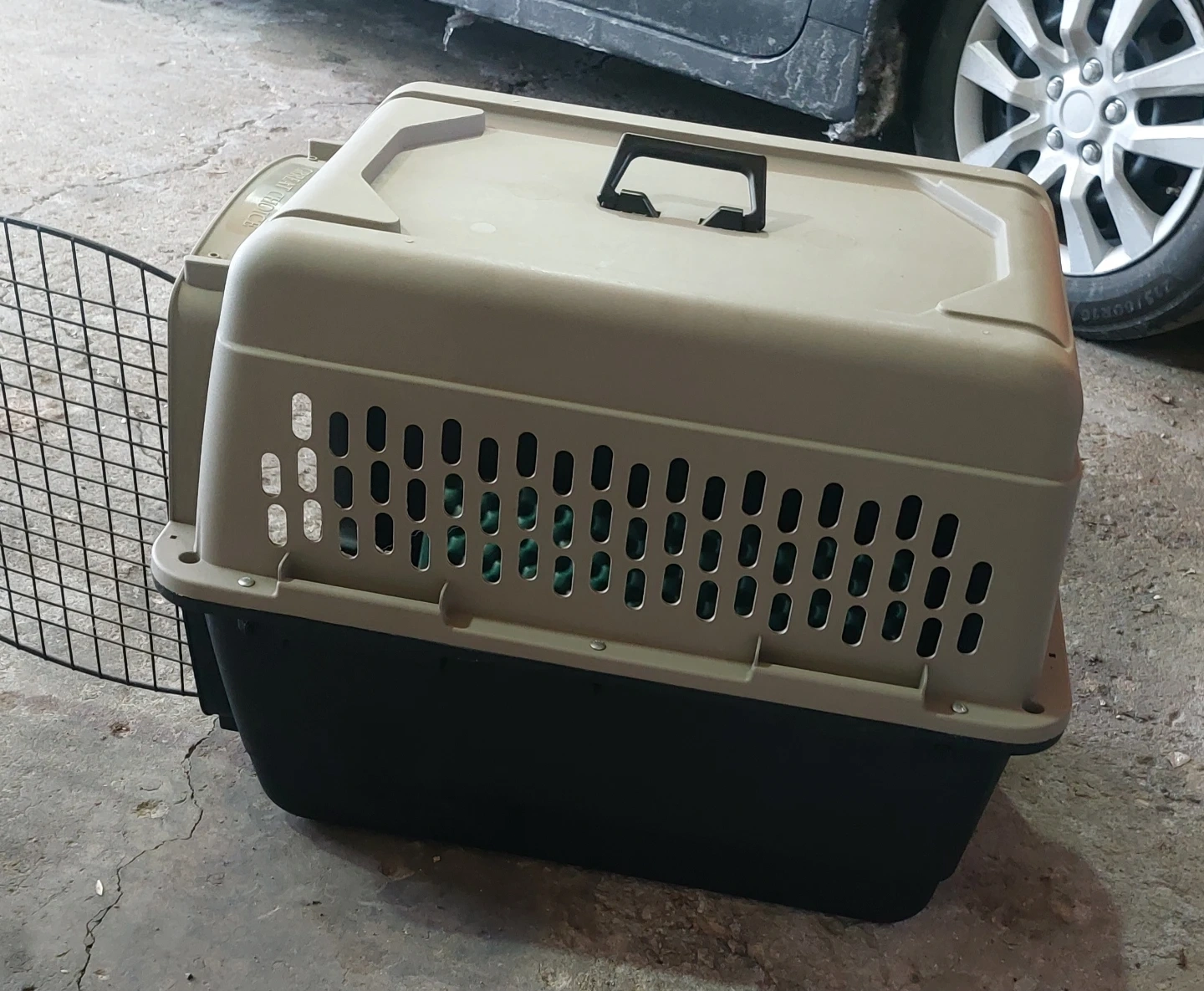 Selling a Great Choice pet carrier in good condition. It measures approximately 20 inches wide, 27 inches deep, and 21 inches tall. Perfect for safely transporting your furry friend!