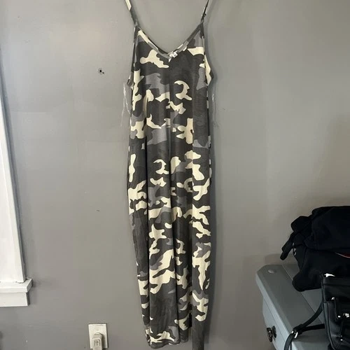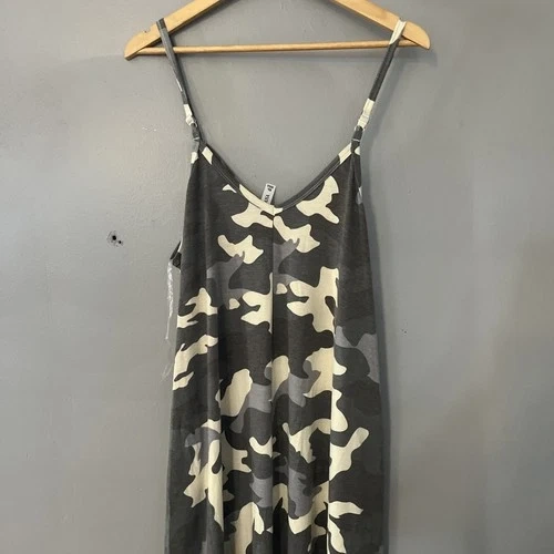 This is a women's maxi dress in size XL, featuring a gray camouflage pattern. It has pockets and a long length, making it both stylish and practical. The dress is by the brand Zenana. Perfect for a casual or outdoor outfit.