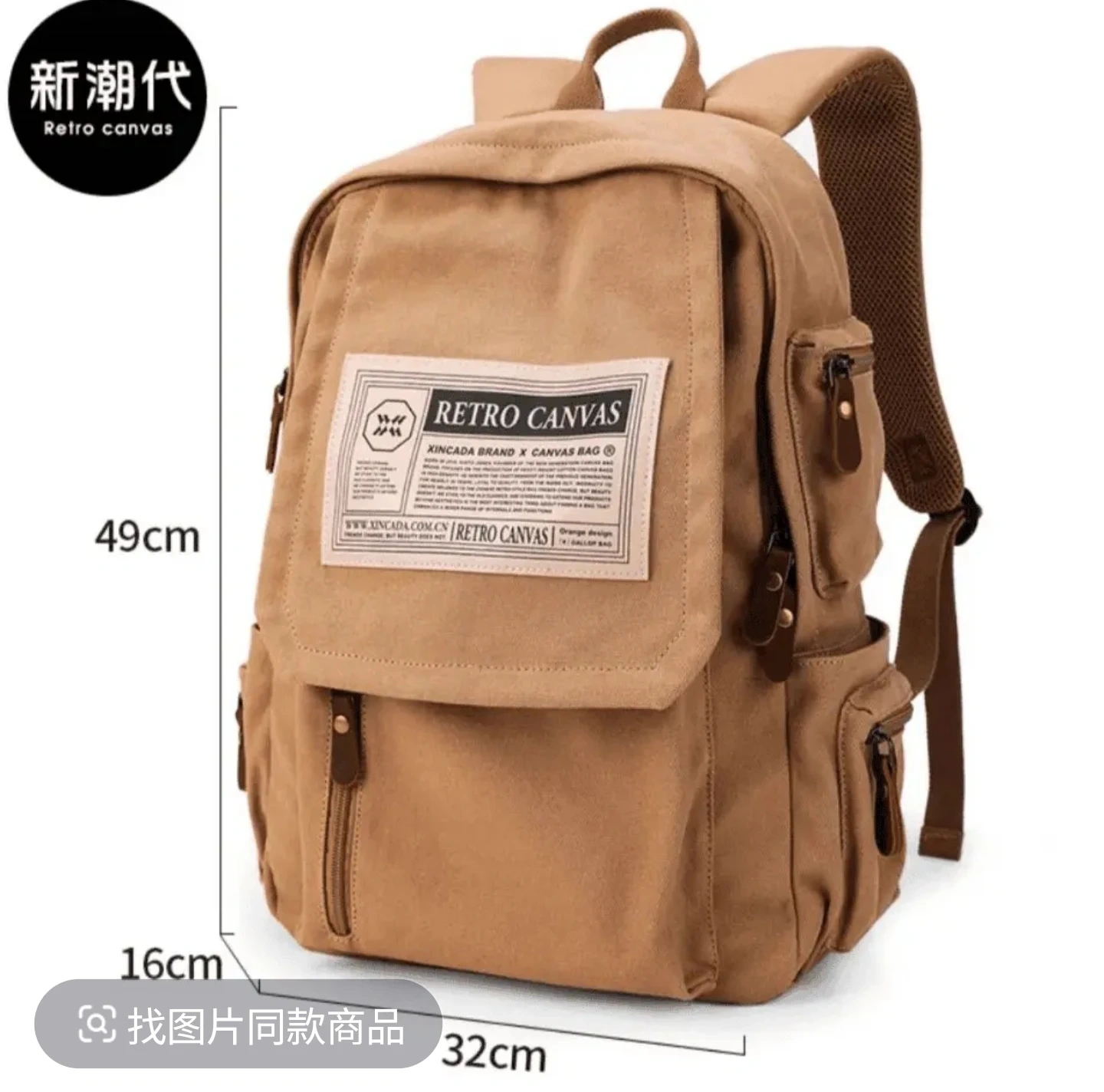 This is a Retro Canvas backpack in a khaki colour. It measures 49cm in height, 32cm in width, and 16cm in depth. It's made of canvas material and features multiple exterior pockets with zip and flap closures.