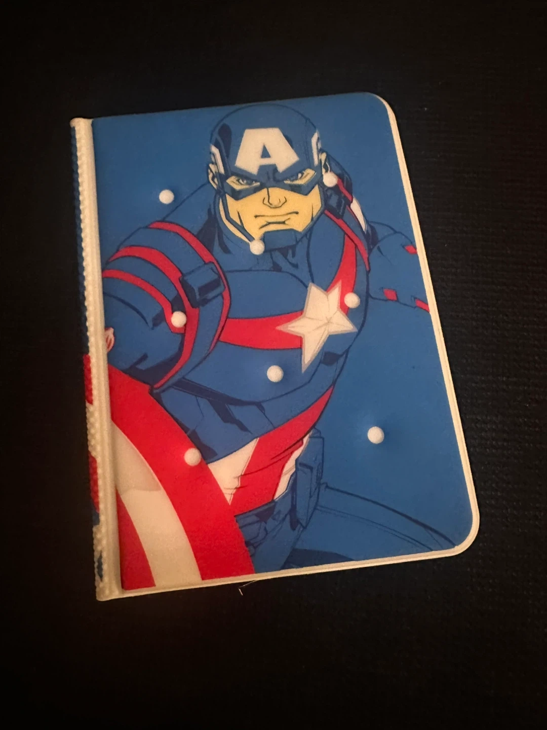This Miniso notebook features Captain America from Marvel. It's a handy size for on-the-go notes. Inside, you'll find slots for cards or IDs.