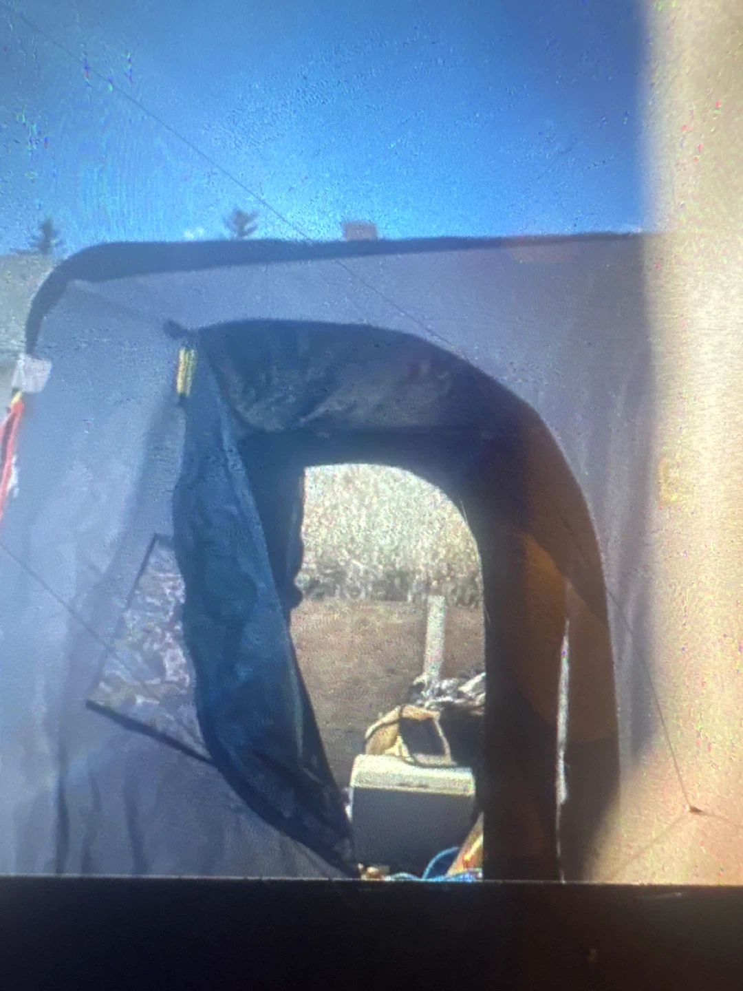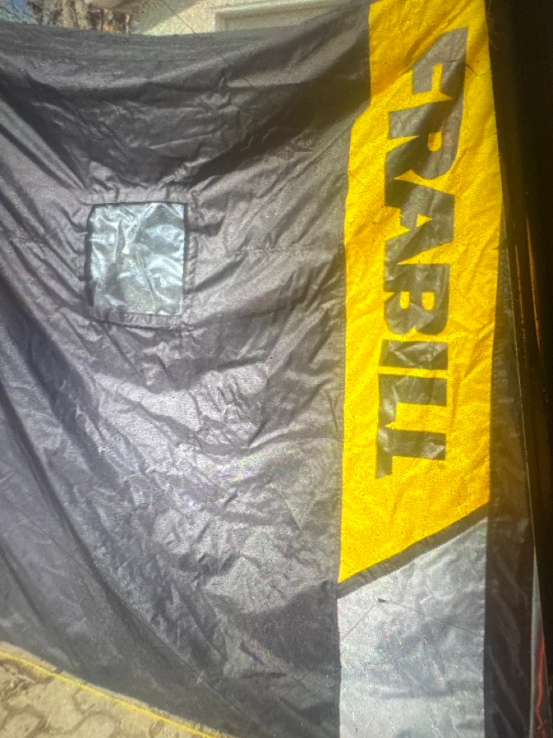 This is a FRABILL ice fishing shelter. It's designed to keep you warm and protected from the elements while you're out on the ice. Shelter has a durable black and yellow exterior. Two of the hinges on the floor have let loose you need to to rivet them back in.