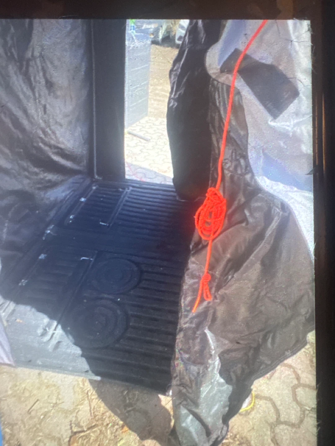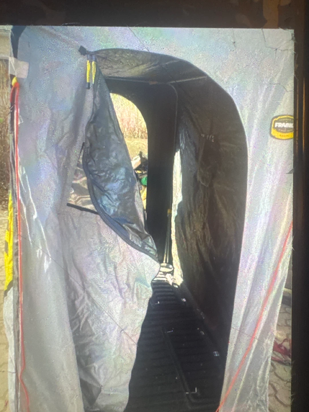 This is a FRABILL ice fishing shelter. It's designed to keep you warm and protected from the elements while you're out on the ice. Shelter has a durable black and yellow exterior. Two of the hinges on the floor have let loose you need to to rivet them back in.