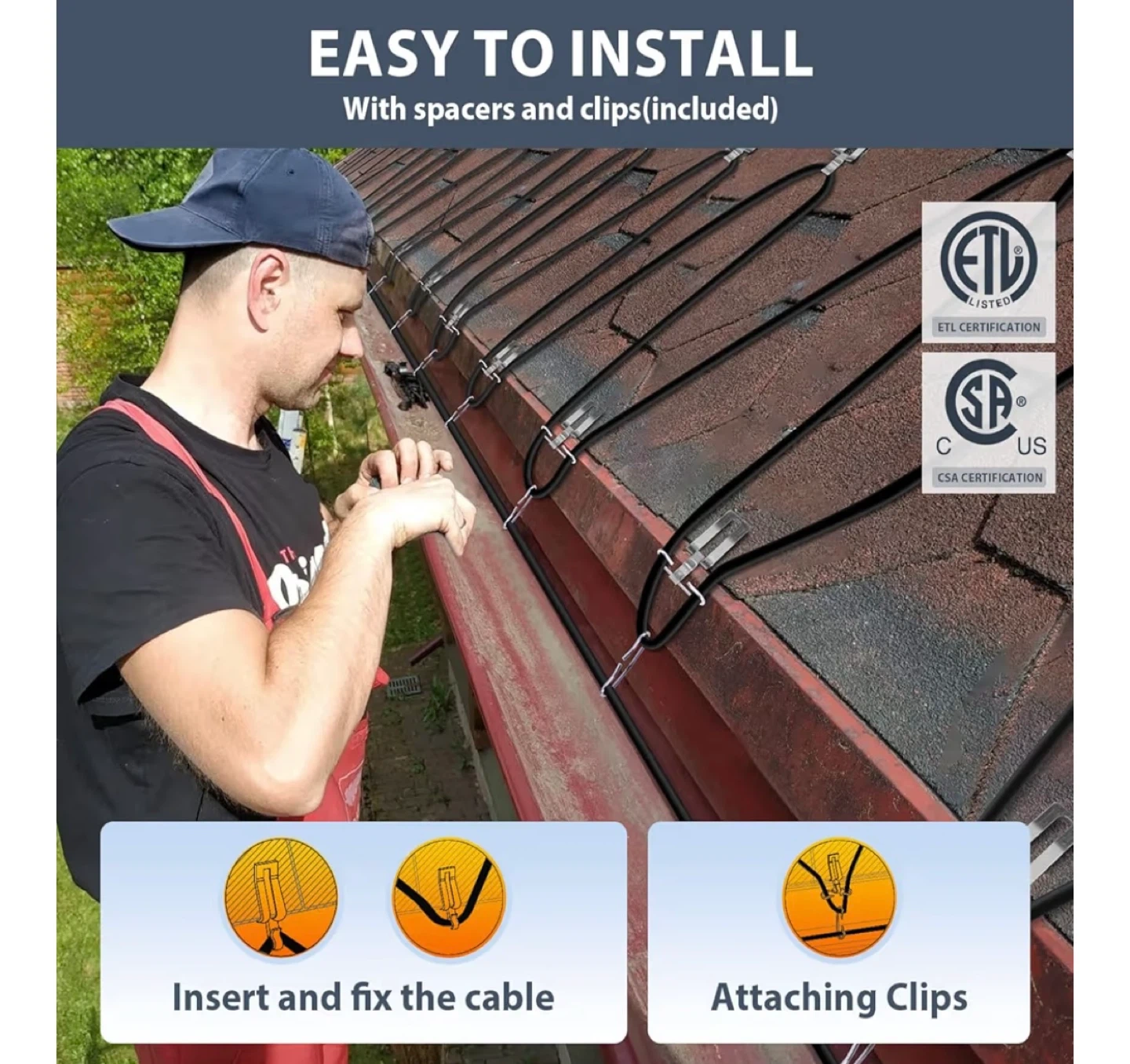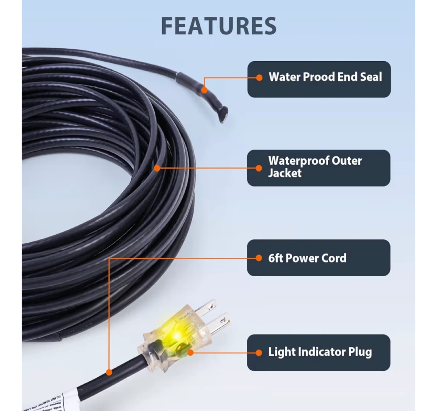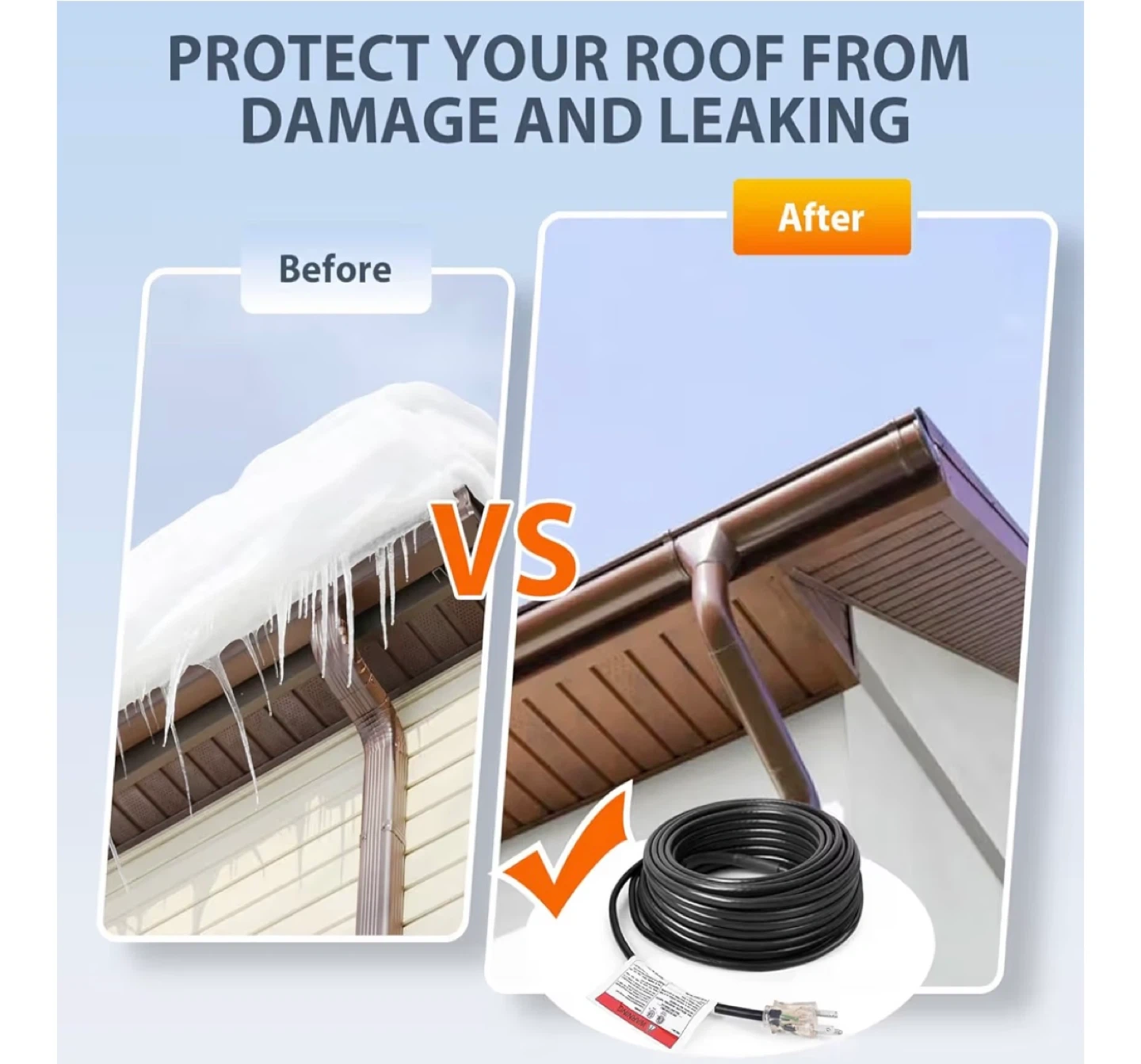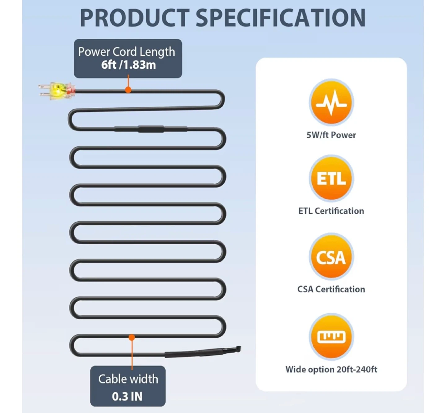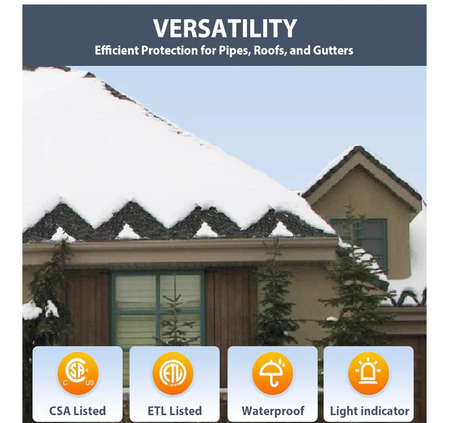 This HEATIT de-icing cable kit is 160-feet long and designed to prevent ice build-up on roofs, gutters, and downspouts. It features a waterproof outer jacket, water-proof end seal, a 6ft power cord, and a light indicator plug. The cable has a width of 0.3 inches and comes pre-assembled for easy installation. Certified by ETL and CSA.