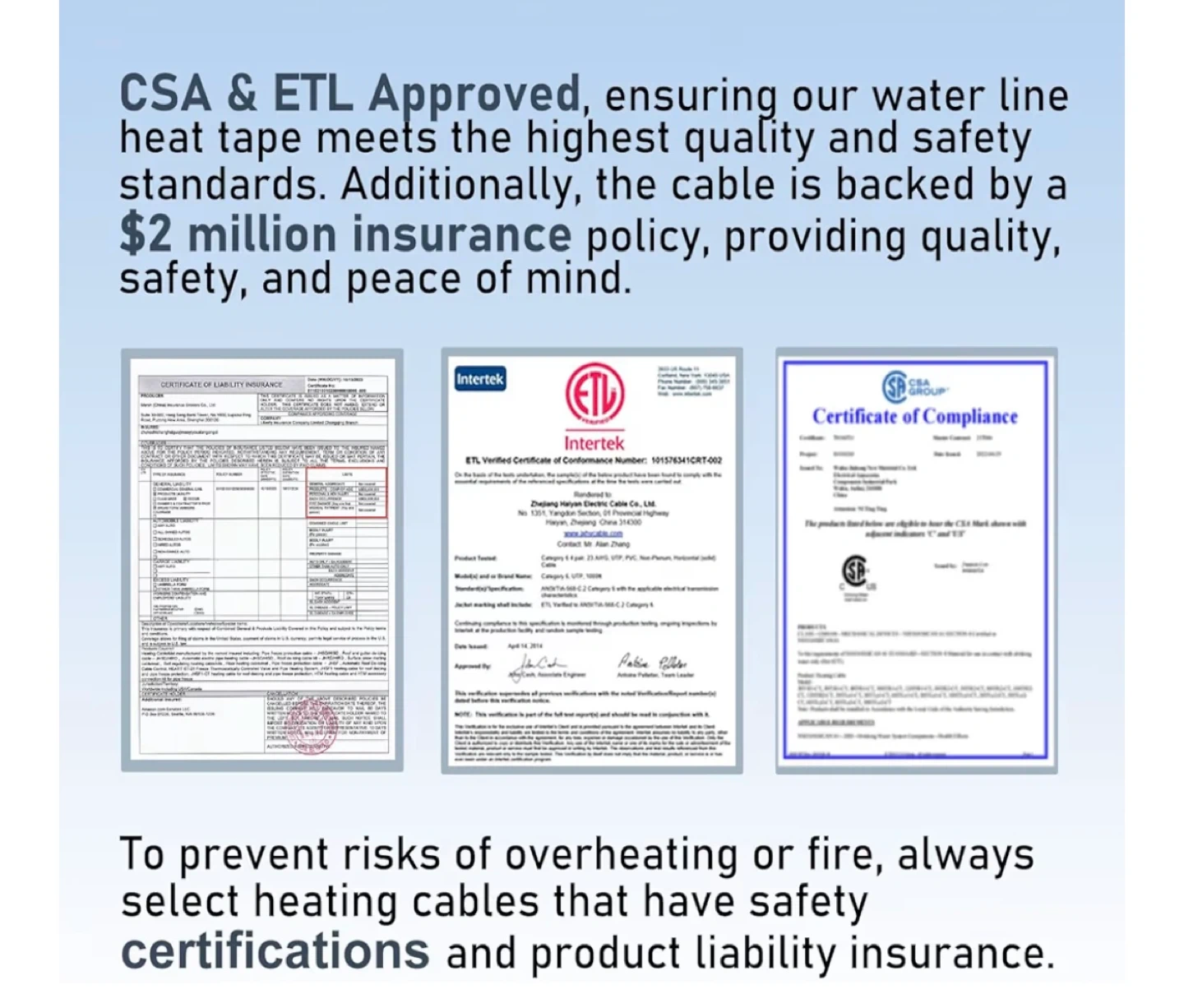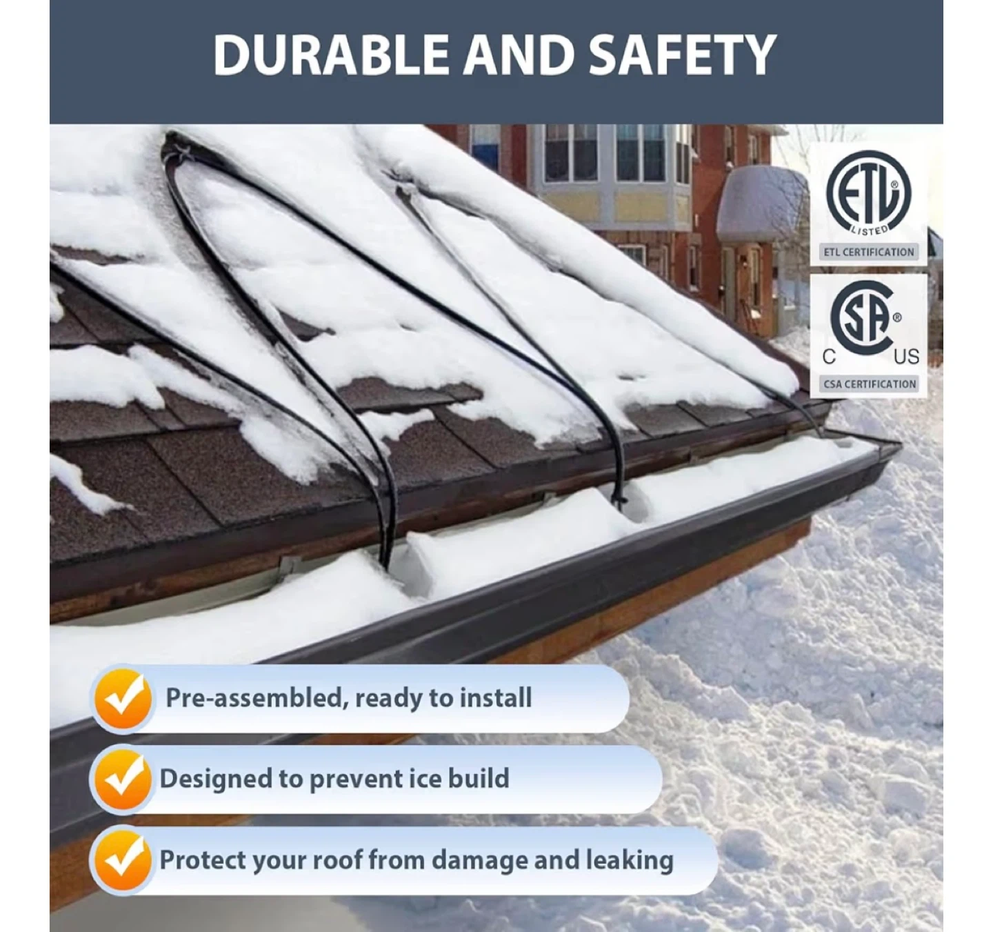 This HEATIT de-icing cable kit is 160-feet long and designed to prevent ice build-up on roofs, gutters, and downspouts. It features a waterproof outer jacket, water-proof end seal, a 6ft power cord, and a light indicator plug. The cable has a width of 0.3 inches and comes pre-assembled for easy installation. Certified by ETL and CSA.