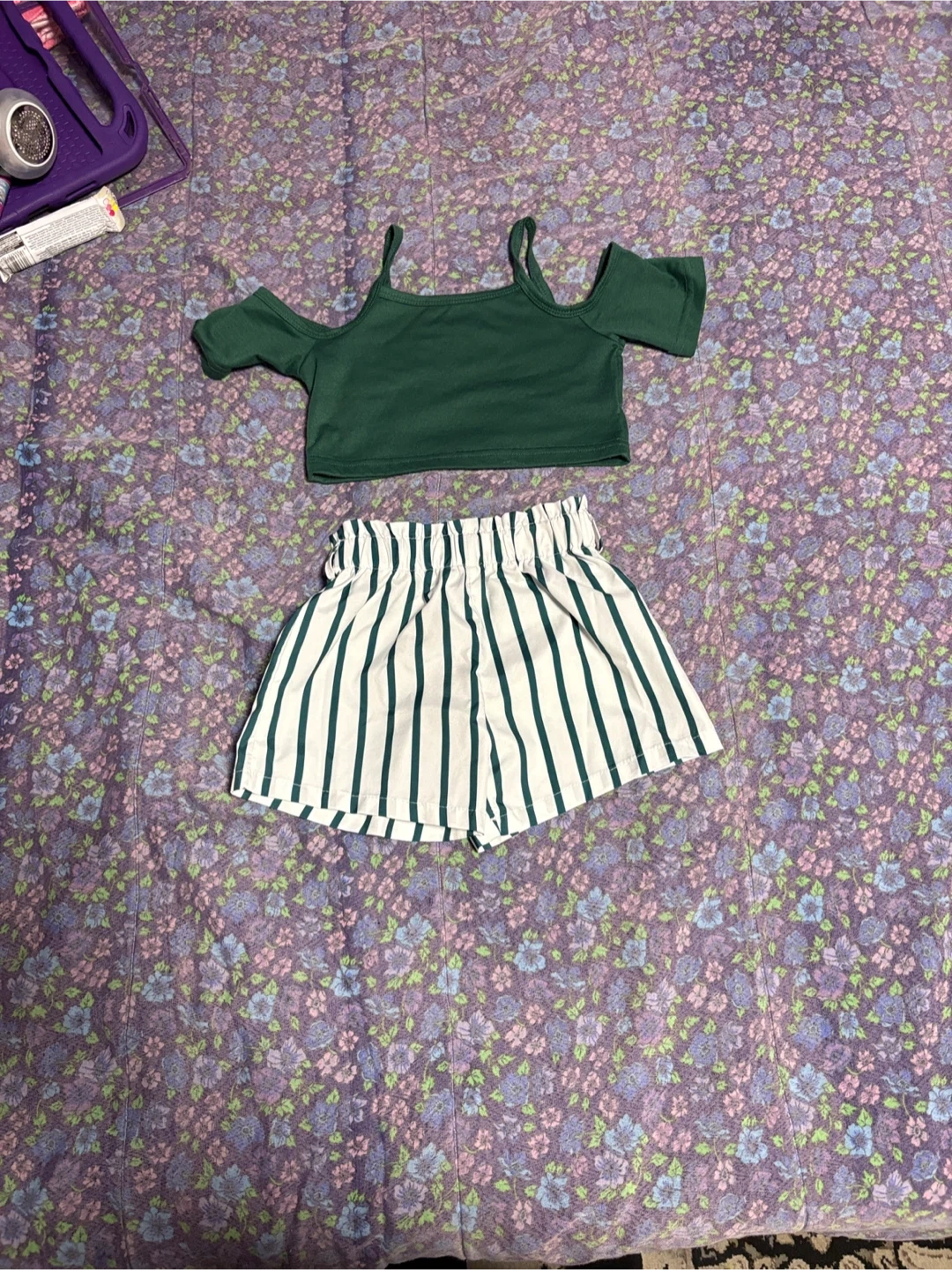Cute little outfit from Shein for your kiddo! This set includes a dark green crop top and striped shorts, both in size 5Y. Perfect for summer days!