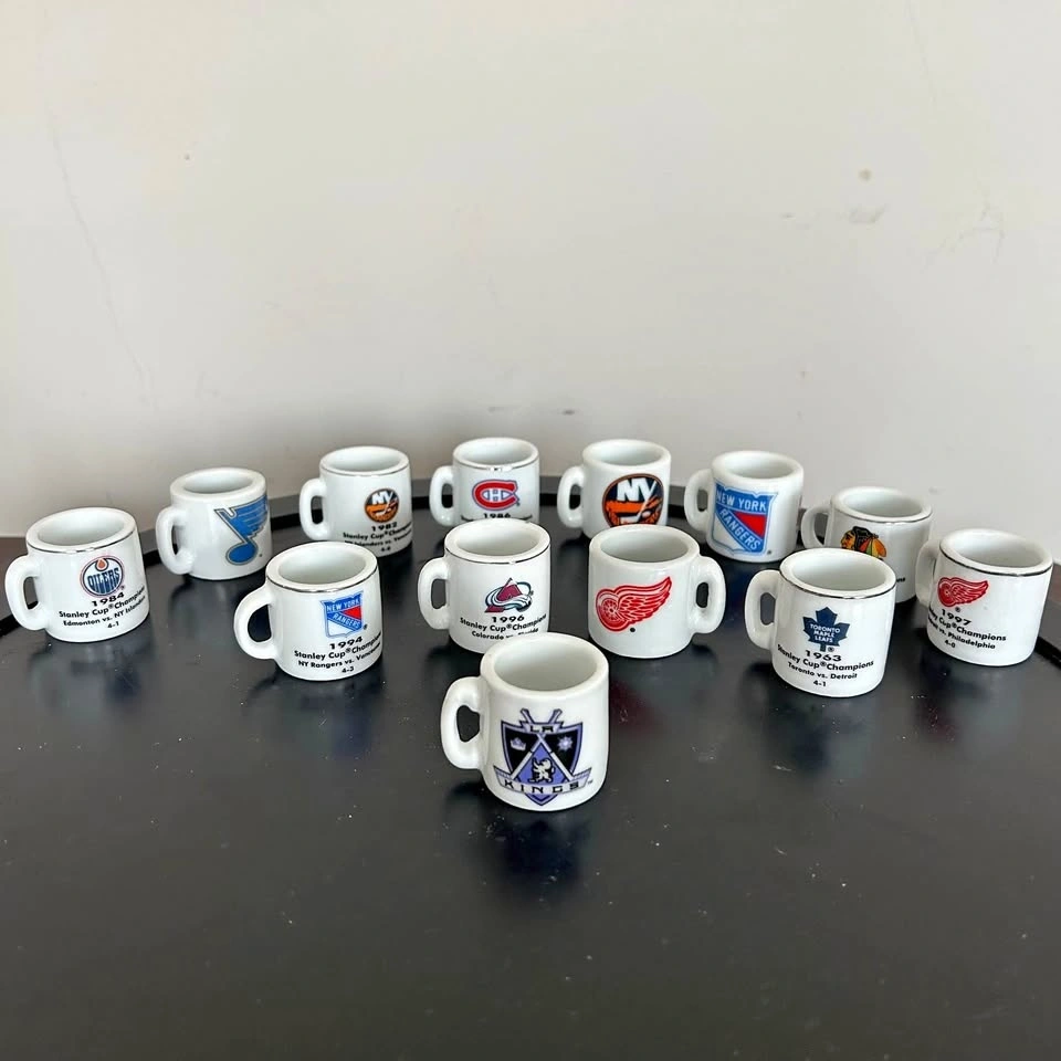 Fun and collectible vintage NHL “Cup Crazy” Stanley Cup Champions mini mug collection featuring 13 miniature ceramic mugs celebrating historic championship wins. Each mug displays a team logo on one side and the Stanley Cup year, opponent, and series score on the other, making them a great nostalgic piece for hockey fans. These miniature mugs capture classic NHL history and are perfect for collectors, sports memorabilia enthusiasts, or as a unique display piece in a hockey-themed room, bar, or fan cave. Their small size and detailed graphics make them especially charming when displayed together as a full set. A great collectible lot celebrating the legacy of the Stanley Cup and some of hockey’s most memorable championship moments. Pick up in the Seton area, Calgary. Cash or e-transfer accepted. See my other listings! Feel free to message if you have any questions!