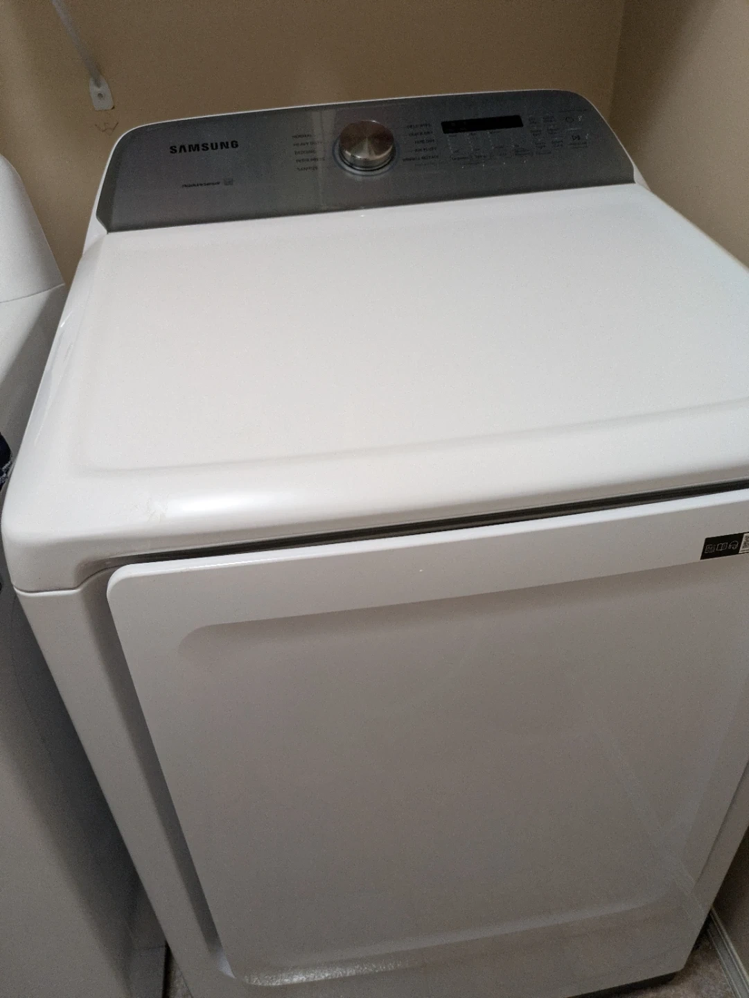 White Samsung electric dryer. Features multiple cycle options for different fabric types. Comes with a spacious drum capacity. Only used for about a month