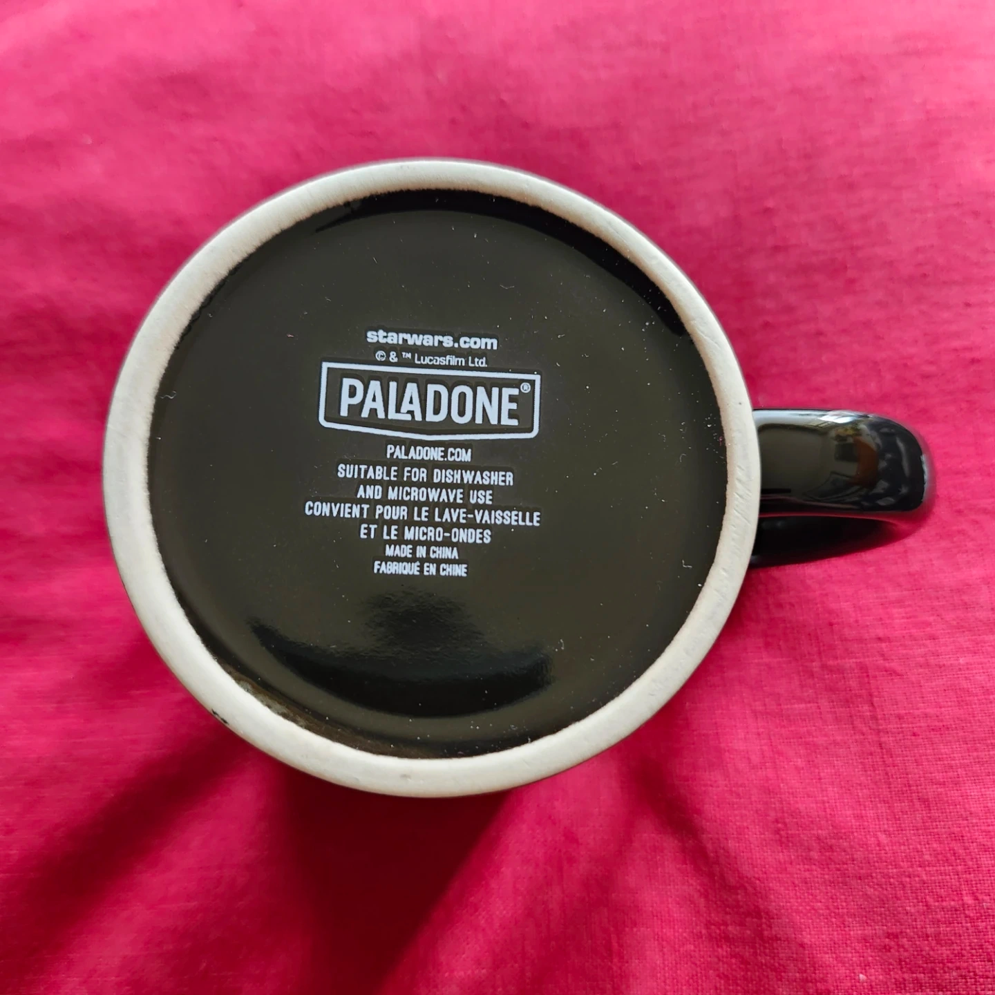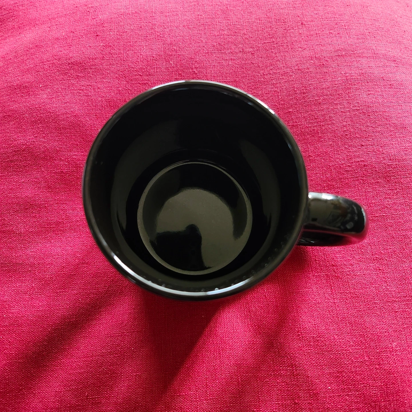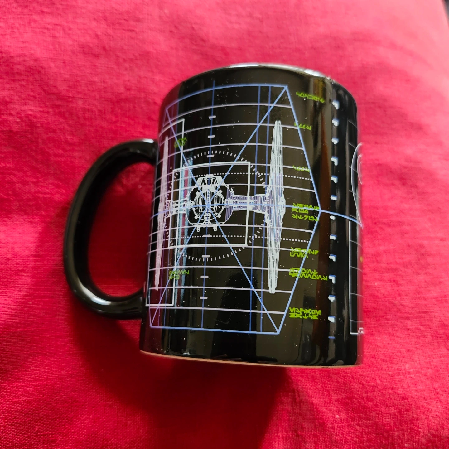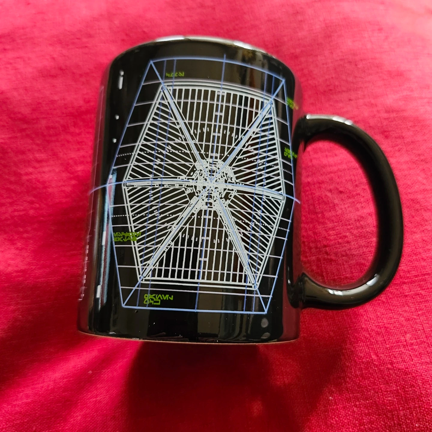 This black ceramic mug features a Star Wars TIE Fighter blueprint design. It's suitable for dishwasher and microwave use. A fun piece for any Star Wars fan!