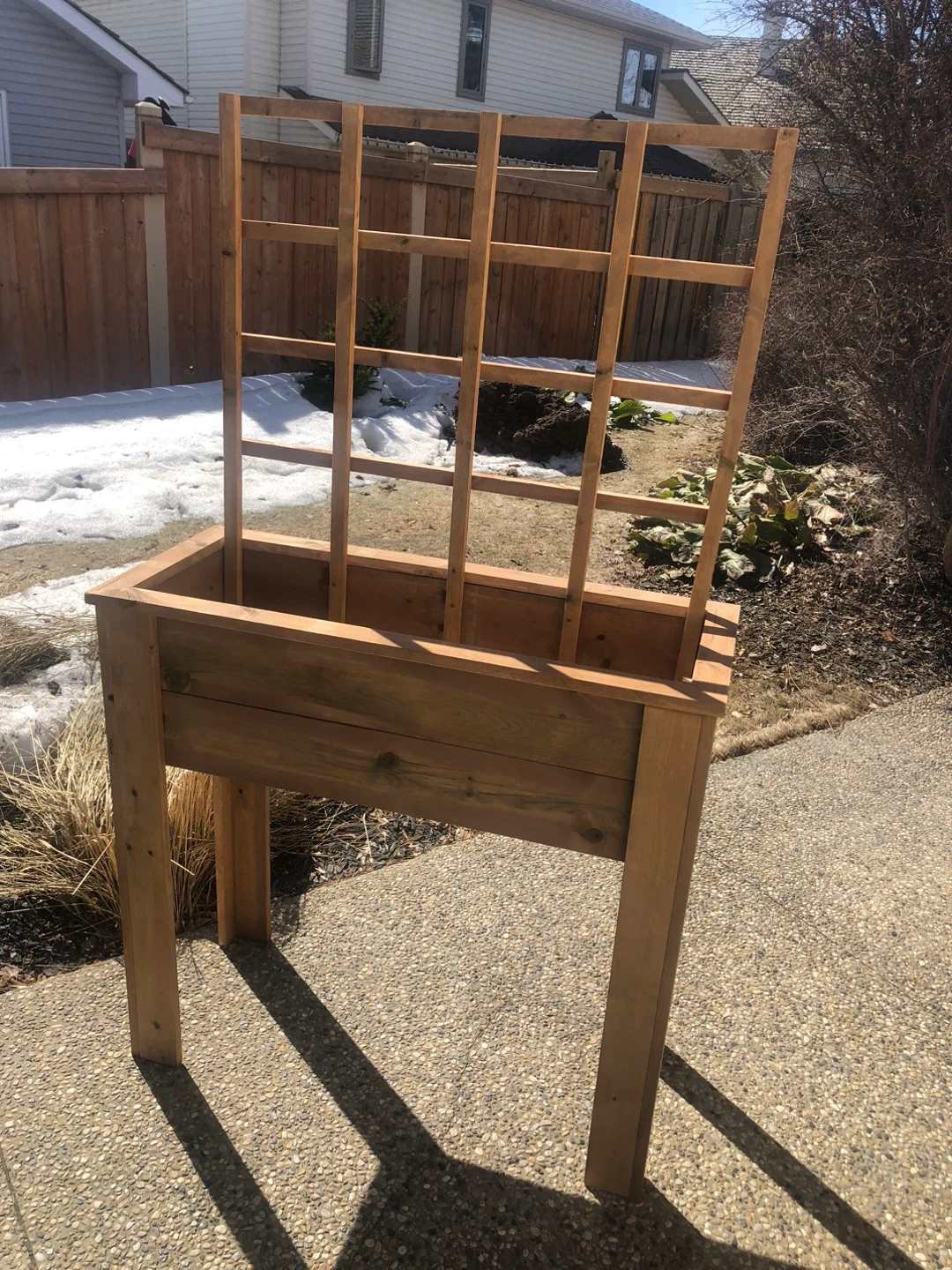 Wooden raised garden planter with an attached trellis. This planter's wood construction is durable and ready for your garden. Great for growing and climbing plants!