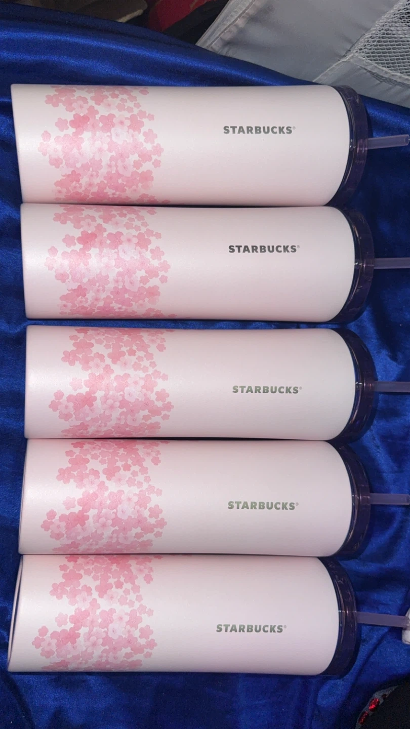 Starbucks tumblers featuring a pink cherry blossom design. Each tumbler includes a reusable straw and lid. $65 ea.