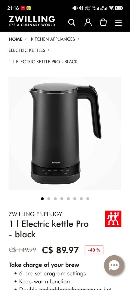Brand new, never opened Zwilling Enfinigy Electric Kettle Pro in black. This 1.0 liter kettle is 1500 watts and features a keep warm function, dual-wall body, stainless steel interior, and temperature presets. Perfect for all your hot beverage needs! Pickup is available near Highway 7 East and Kennedy Road in Richmond Hill, close to the Saigon Star restaurant plaza.