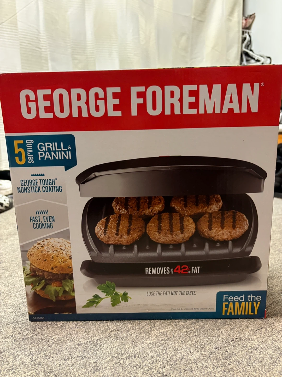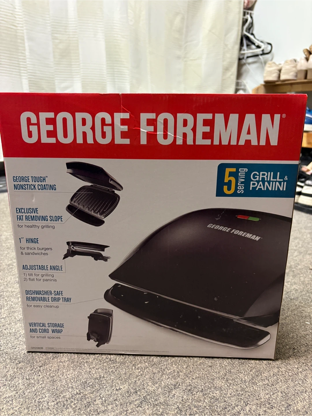 This George Foreman grill and panini press serves 5. It features George Tough nonstick coating for easy cleanup. The removable drip tray is dishwasher safe. It's great for healthy grilling and fast, even cooking!