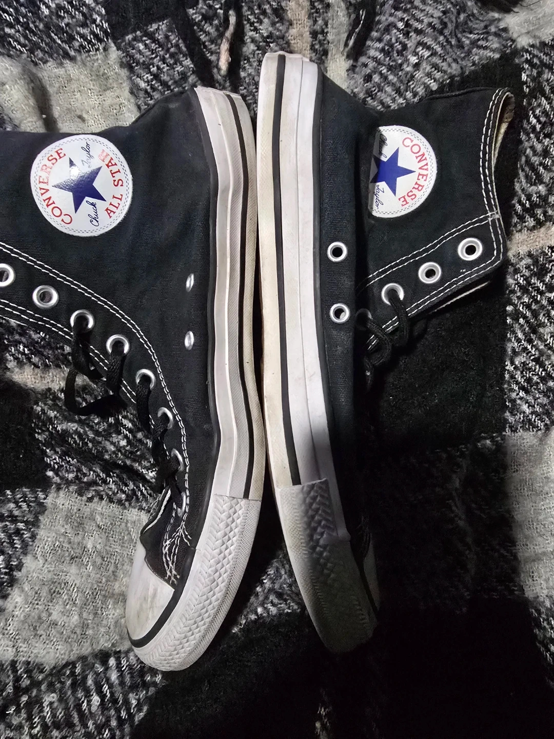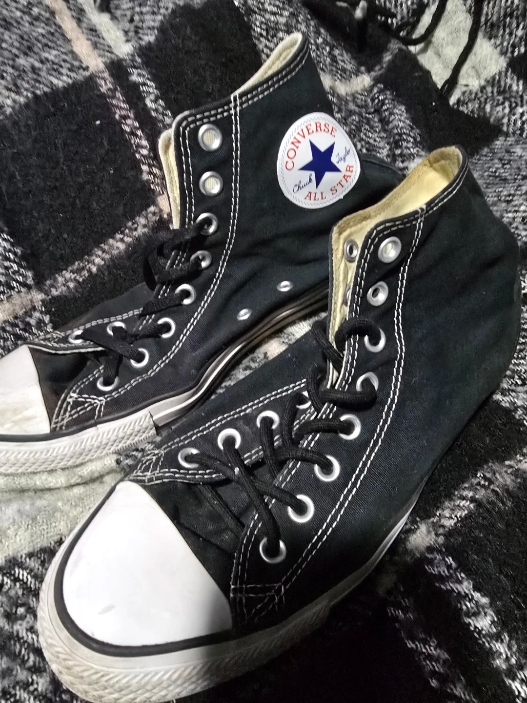 Black Converse Chuck Taylor All Star high top sneakers. Classic canvas upper with the iconic Chuck Taylor logo patch. Rubber toe cap and sole. Size 11