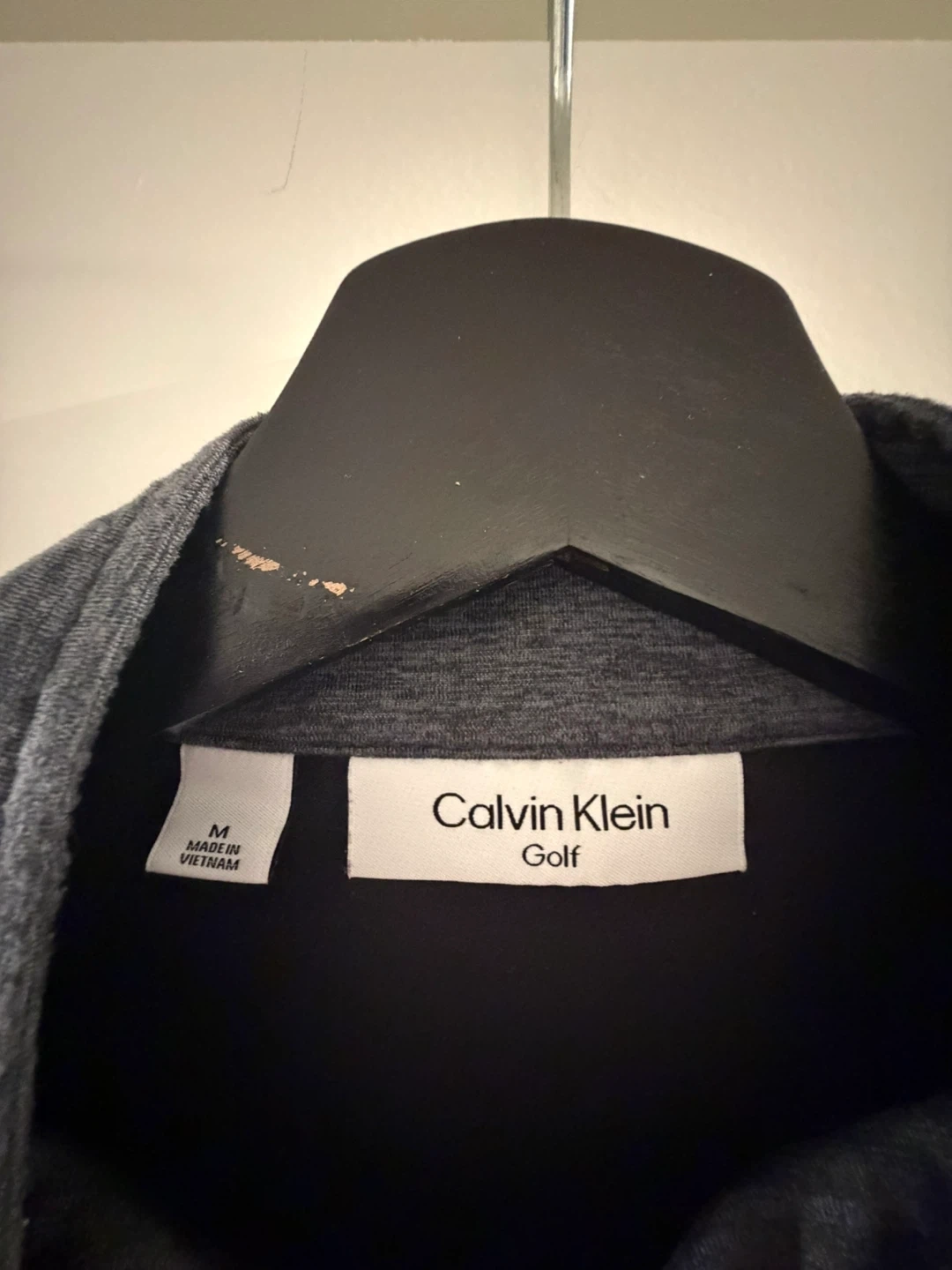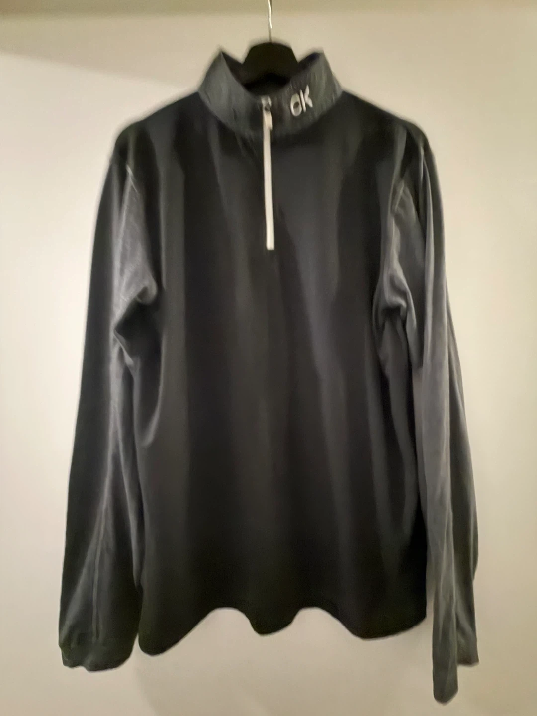Calvin Klein Golf pullover for men. Size medium. It's a dark grey colour with a white zipper accent. Perfect for the golf course!