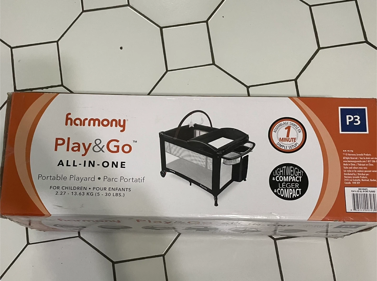Selling brand new playard un open box. The Harmony Play & Go All-in-One playard is the newest addition to Harmony’s lineup of premium baby gear. This all-in-one playard builds on Harmony’s heritage of better materials, better construction and better price!