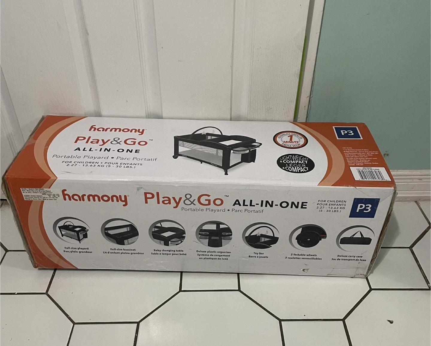 Selling brand new playard un open box. The Harmony Play & Go All-in-One playard is the newest addition to Harmony’s lineup of premium baby gear. This all-in-one playard builds on Harmony’s heritage of better materials, better construction and better price!