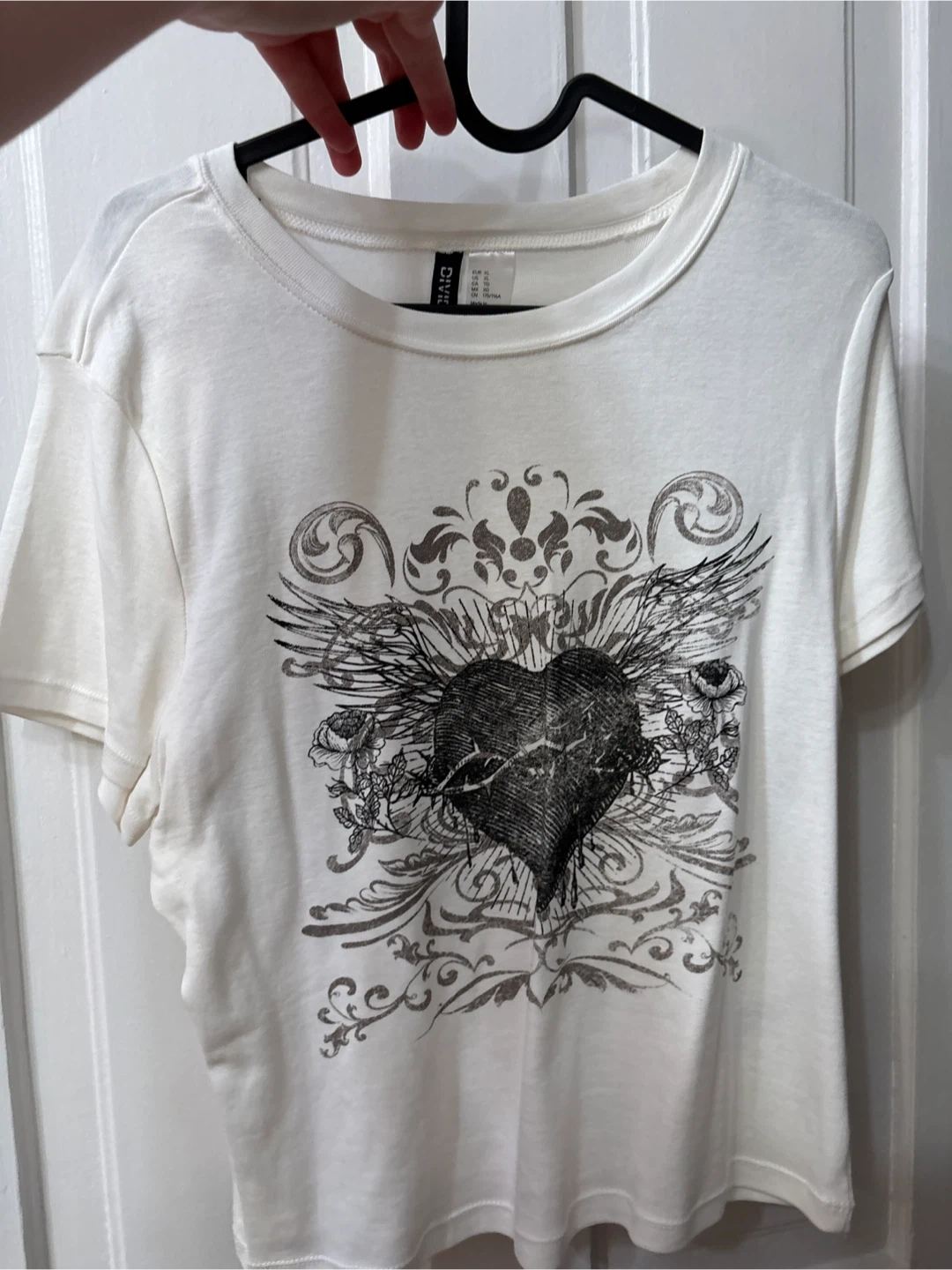 Selling a cream-colored H&M Divided T-shirt. It has a heart and wings graphic on the front. In great condition. Good affliction esc dupe, never worn.