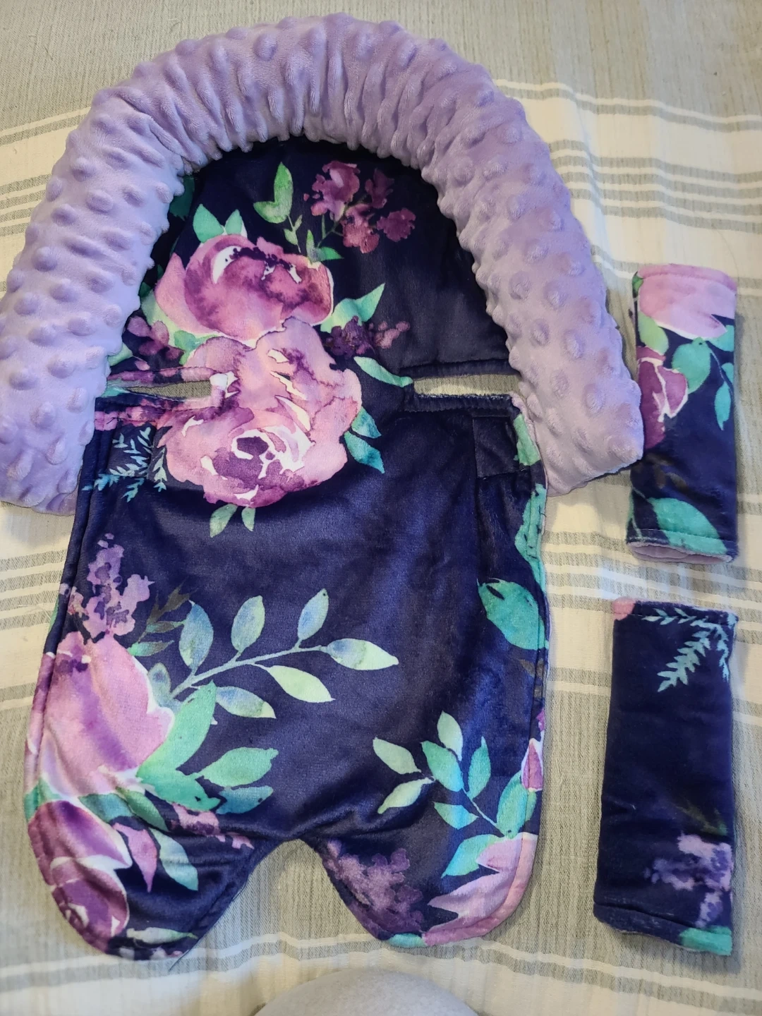 This car seat insert features a beautiful floral design in shades of purple and green on a dark purple background. It includes a plush, lavender head support and matching strap covers. It's in great condition and ready to keep your little one comfy and stylish!
